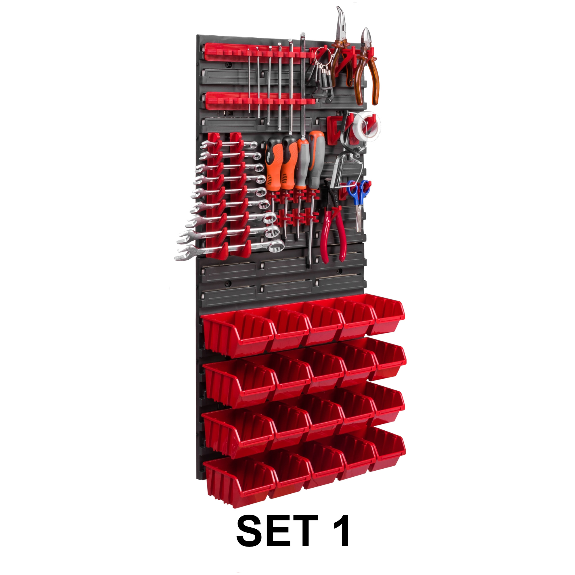 1x Schraubenschlüsselablage / 2x Klemmleisten / 4x Werkzeughaken M Klein / 4x Werkzeughaken XXL Groß / 8x Werkzeugklemme