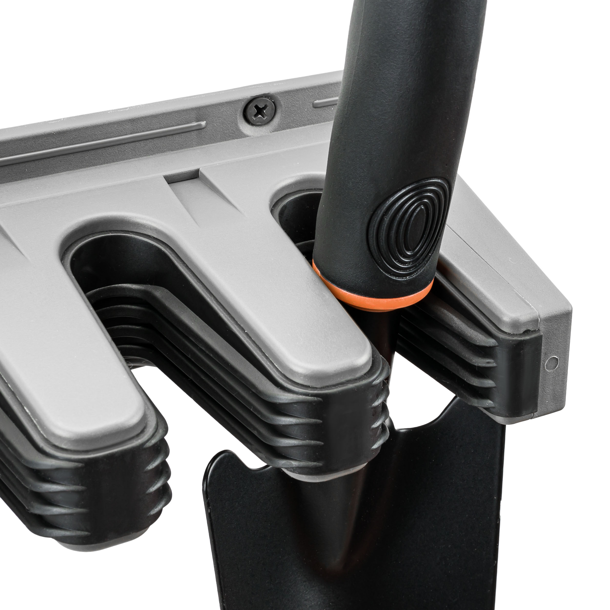 Gerätehalter klein aus Kunststoff / Halterungen innen gummiert / Abmessungen (L xB x H) 310 x 70 x 98 mm / max. Belastung 15 kg / Farbe grau / Besenhalter 5 geeignet f. Werkzeugwände ITBNN. Auch geeignet für Wandplatten ( ITBNN ) und Werkzeugwände aus unserem Sortiment.