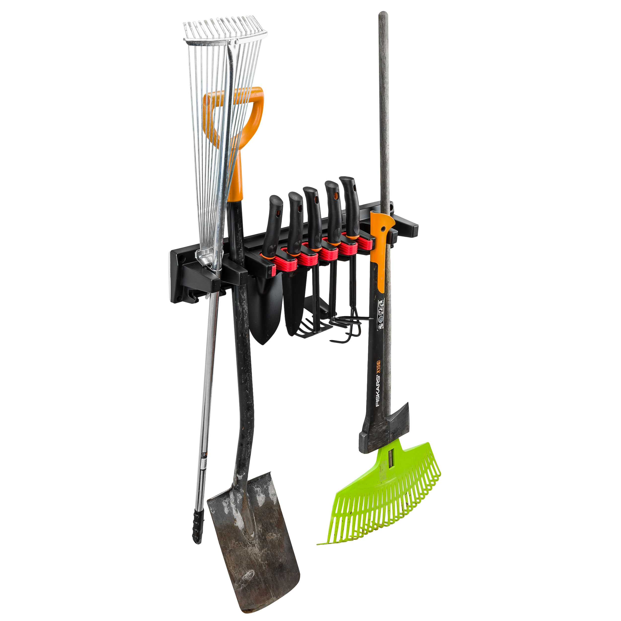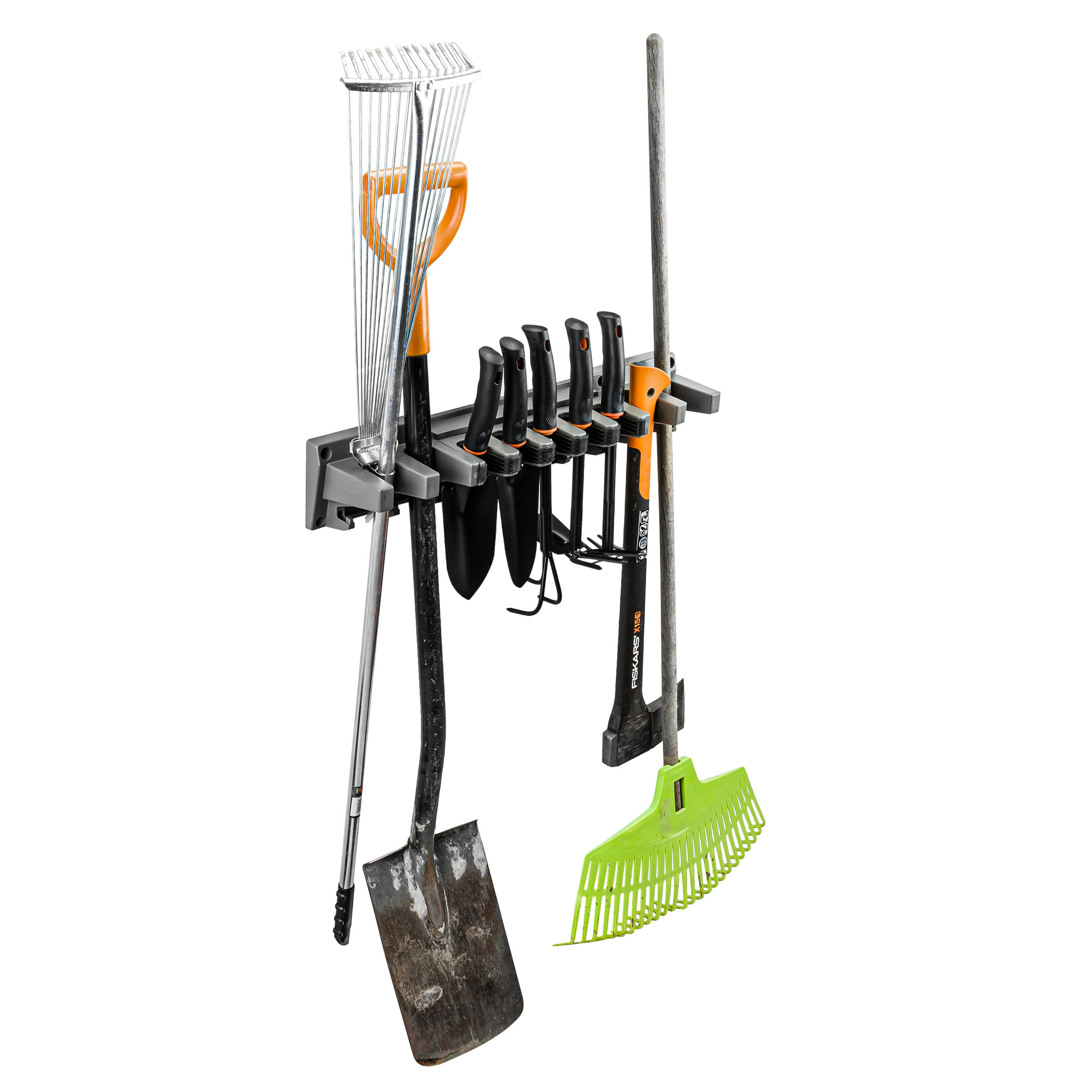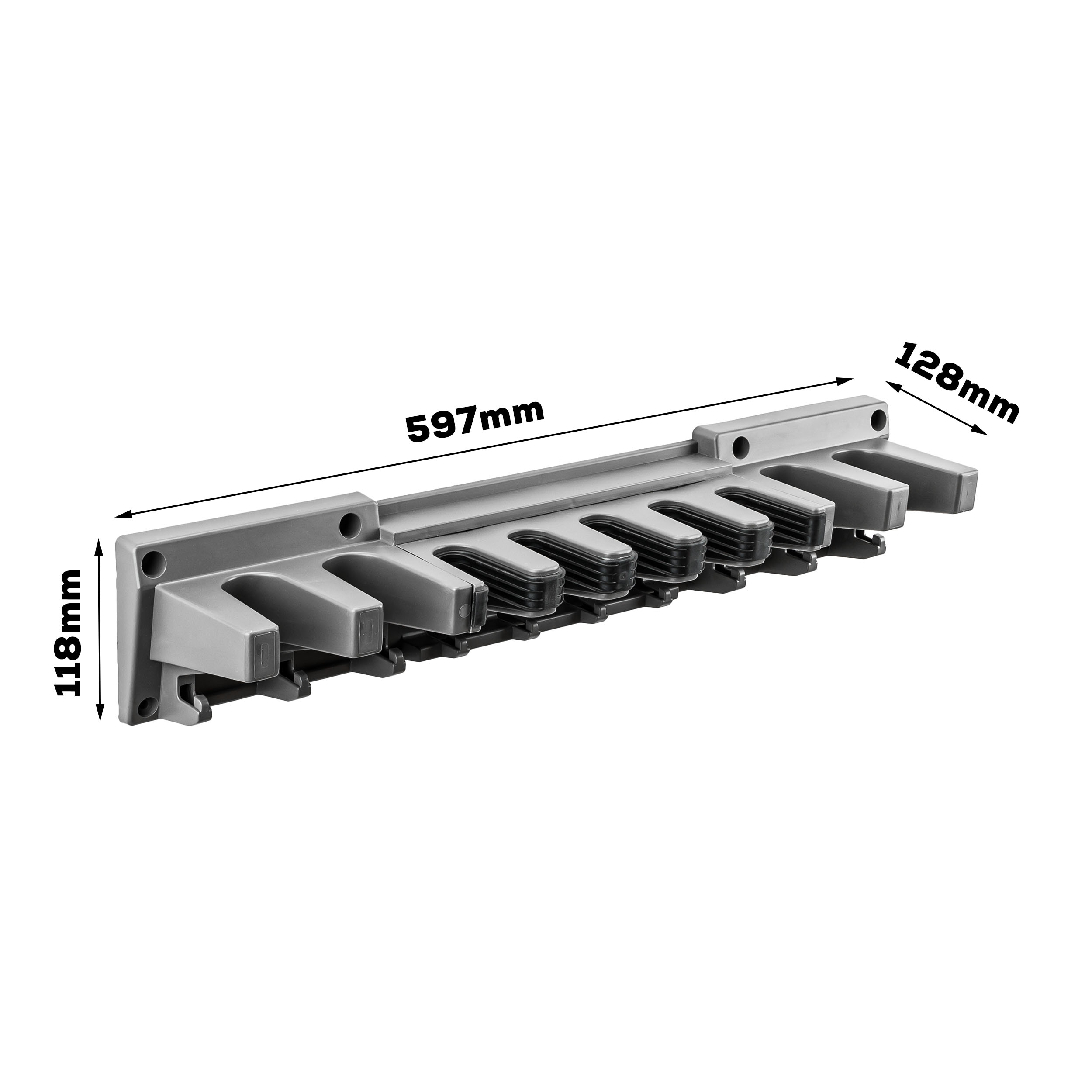 Gerätehalter groß aus Kunststoff / Halterungen innen gummiert / Abmessungen (L xB x H) 597 x 118x 128 mm , max. Belastung 15 kg / Farbe grau / Haken groß / klein 6 / 4 , Besenhalter groß / klein 4 / 5 , geeignet f. Werkzeugwände ITBNN