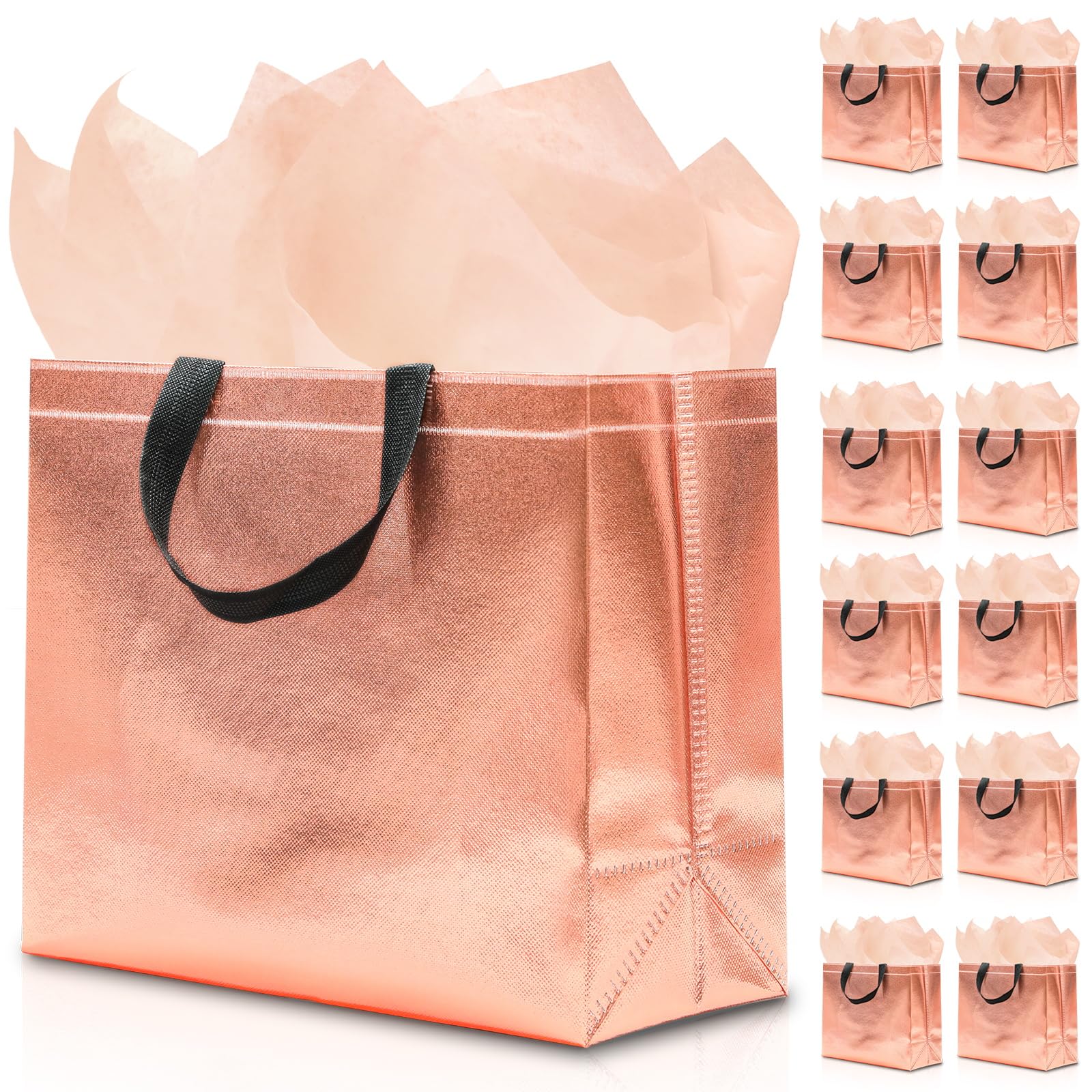 - 【Light, Foldable & Ready for Any Occasion】Our 12 reusable gift bags with handles are lightweight and foldable for easy storage without taking up space. These shiny rose gold gift bags are perfect for any event such as a birthday, wedding, bachelor party, etc. Whether used as a gift bag, shopping bag or party gift bag, these versatile bags are designed to enhance the atmosphere of every occasion.