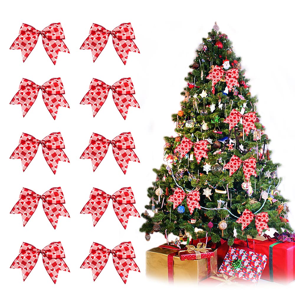 Material: Linen, Burlap Size: 6.09 inch * 4.72 inch Pattern: Glitter loving heart bow, red burlap ribbon bow Package included: Valentine's Day red buffalo plaid bows *10 Wide application: These holiday ribbon bows are suitable for home decoration. They can be decorated on gifts, walls, doors, yards, flower baskets, trees, party backgrounds, windows, fences, fireplaces, stairs, etc. You can also apply it to Valentines party/anniversary/wedding scenes to add a special feeling. Note: 1. Due to the different monitor and light effects, the actual color of the item might be slightly different from the color shown in the pictures. Thank you! 2. Please allow 1-2 cm measuring deviation due to manual measurement. 3. After the wreath bow arrives, it may be squeezed or deformed due to packaging and logistics handling. But don't worry, just adjust it slightly, it will become full as shown in the picture.