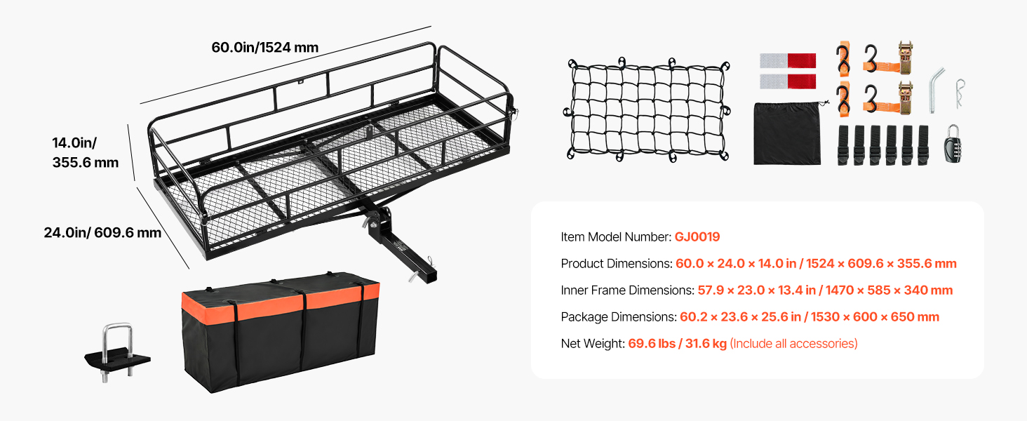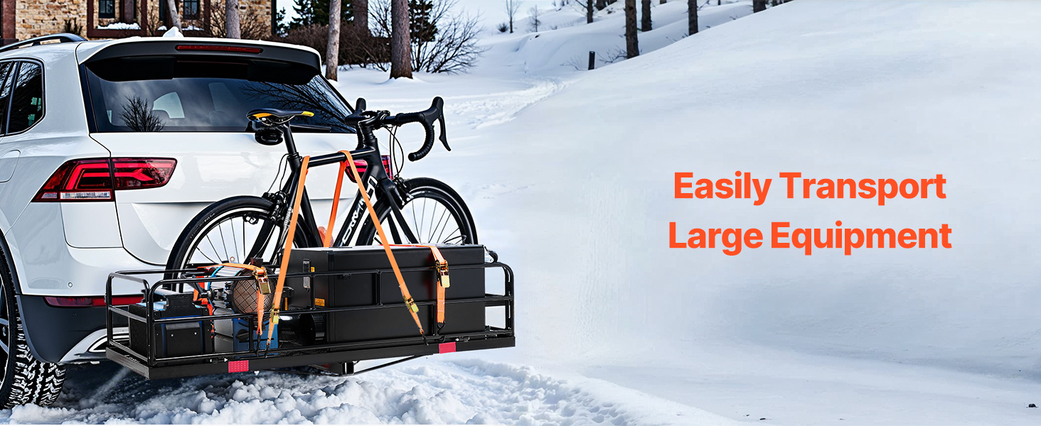 - 500lbs Extra Storage Space: Our hitch cargo carrier measures 60 x 24 x 14 in/1524 x 609.6 x 355.6 mm, equipped with bag, cargo net, ratchet straps, and other accessories, which can be used to load different sizes of cargo. Say goodbye to looseness, and is not easy to fall off.