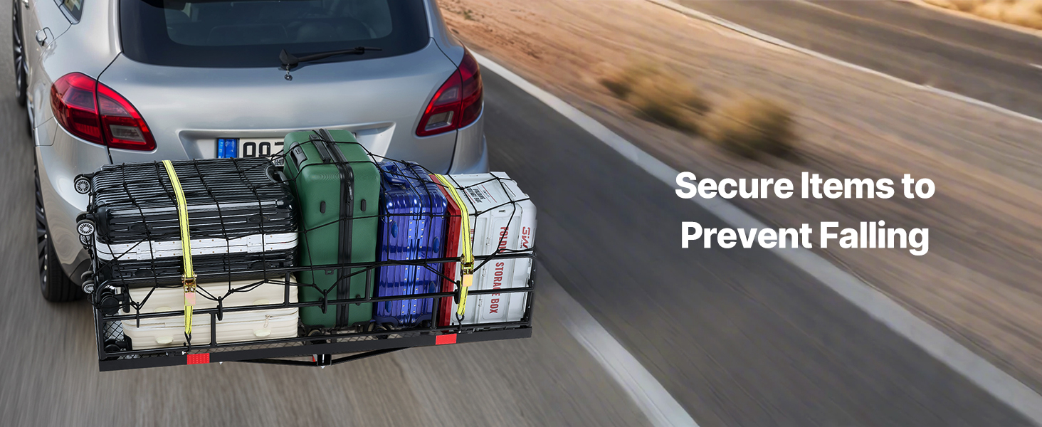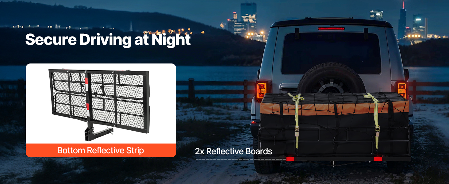 - Night Reflective Reminder: Our hitch cargo carrier is equipped with 2 red reflective panels and 1 bottom reflective sticker to ensure secure driving at night, rainy days or other bad weather.