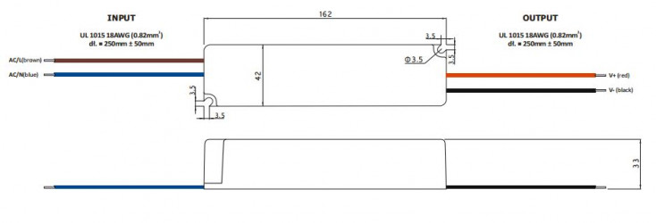 Safety standards: compliance to EN61347-1, EN61347-2-13, IP67 Withstand voltage: I-P/O-P: 3kVAC Isolation resistance: I-P/O-P; O-P/FG; I-P/FG: 100MΩ/500VDC/25°C/70% EMC emission: compliance to EN55015 EMC immunity: compliance to EN61547; EN55024; EN61000-4-2, -3, -4, -5, -6, -8, -11 Harmonic current: compliance to EN61000-3-3; EN61000-3-2 Other: Dimensions: 162 x 42 x 33mm Weight: 0.38kg Termination style: flying leads, approx. 250mm ± 50mm (UL 1015 18AWG (0.82mm )) IP67 |
