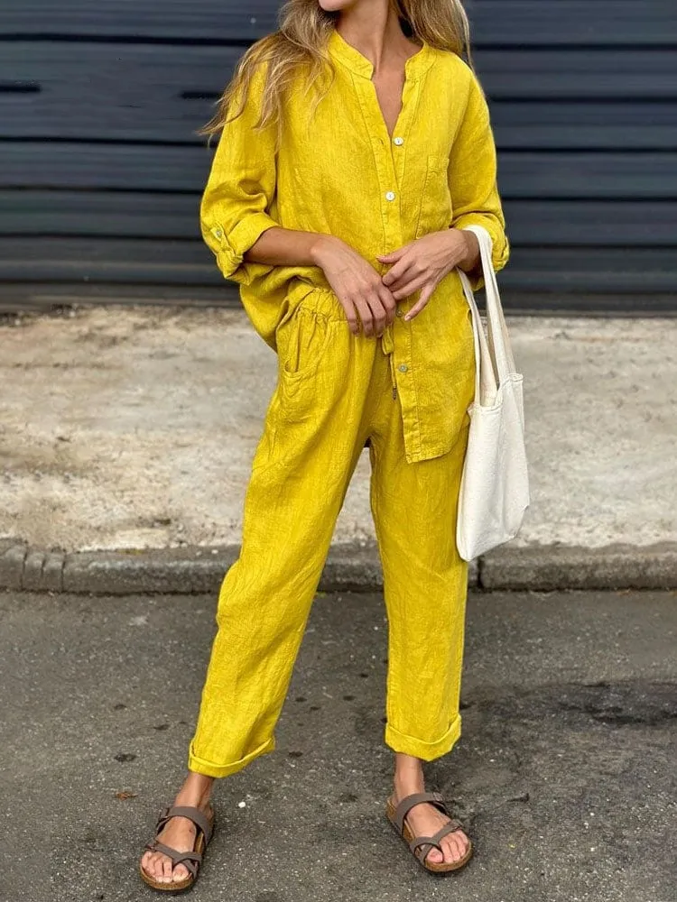 Women's Cotton Linen Solid Color Two-piece Sets 2025 Spring Autumn Fashion V Neck Top Elastic Waist Loose Wide Leg Pants Set