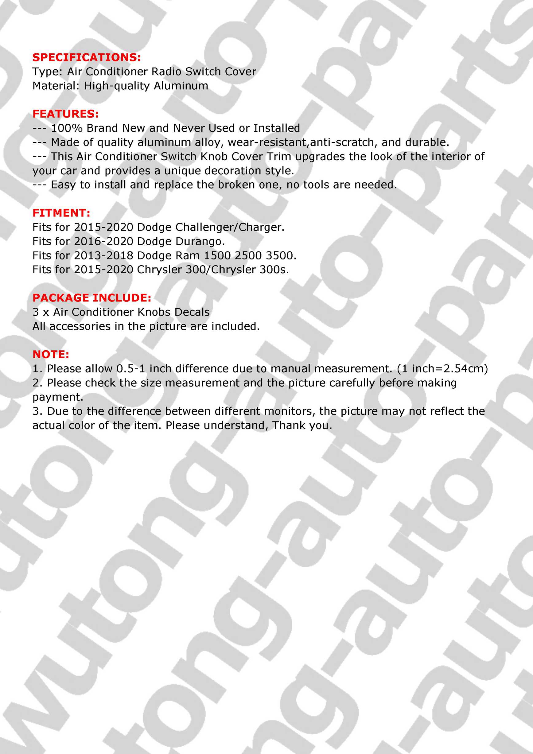 3X AC Radio Switch Trim Ring Knob Cover for Dodge Challenger/Charger 2015-2022