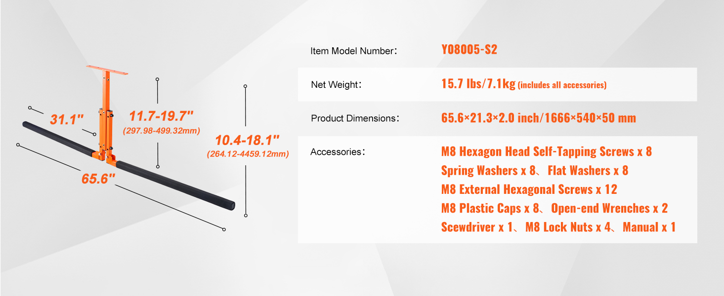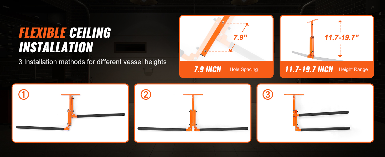 3 Height Adjustable: Adjust the support arms based on equipment height. The distance between each hole is 7.9 inch/200 mm, with a height adjustment of 11.7-19.7 inch for loading kayaks, paddleboards, and more. If the height of the kayak ceiling rack is shorter and closer to the ceiling, you can safely place flat devices like paddle boards to prevent them from falling.