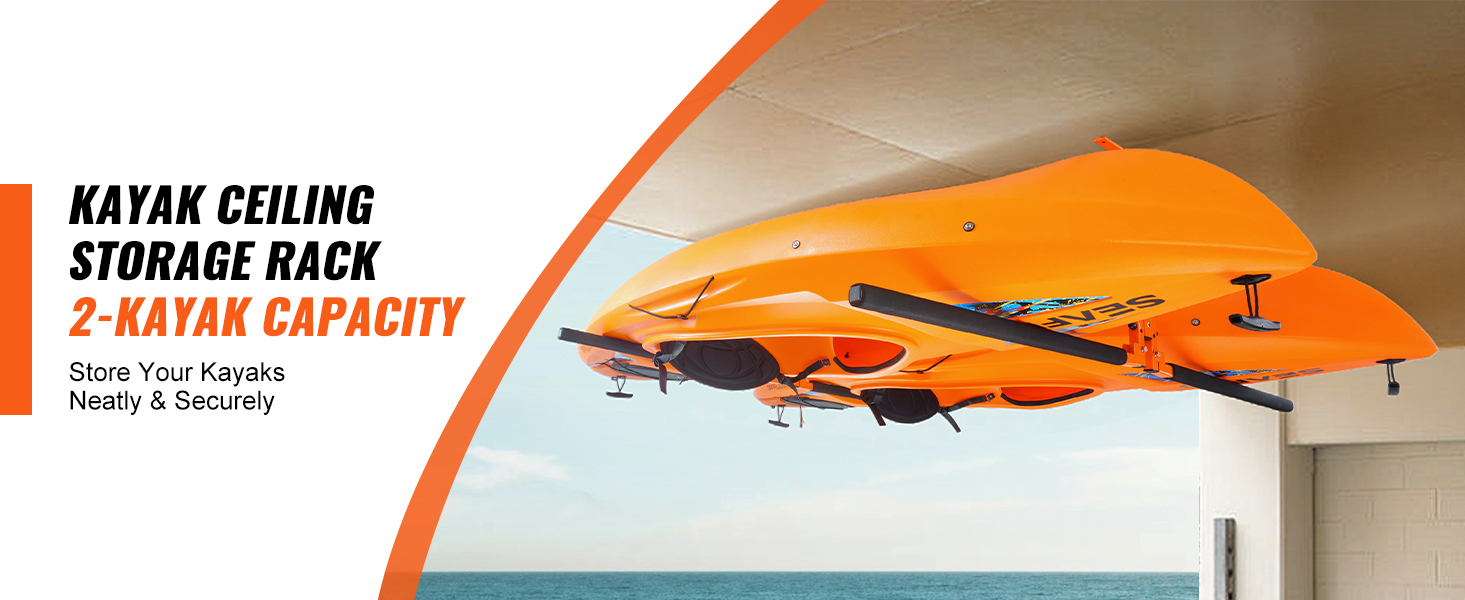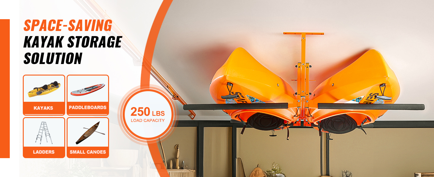 High Load, Carry 2 Kayaks: Made of heavy steel structure, the kayak storage rack's total load can reach 250lbs / 113.5kg, can stably carry 2 kayaks, and long-term bearing will not easily deform and fracture, so that you can carry love boat at ease, of course, you can use to carry small canoes, paddle board, and other water sports equipment.