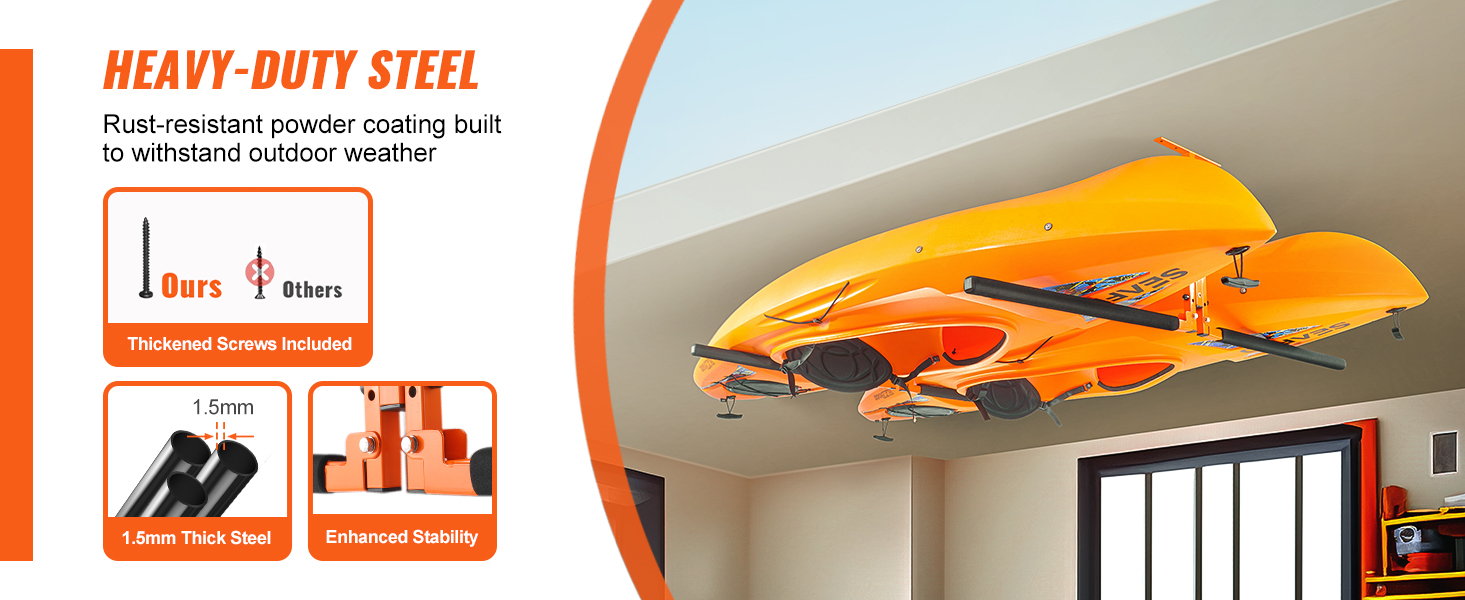 Reinforcement Design: The support arms and the columns are fixed with multiple thick screws to strengthen the stability. The kayak rack for garage is not easy to bend after long-term use.