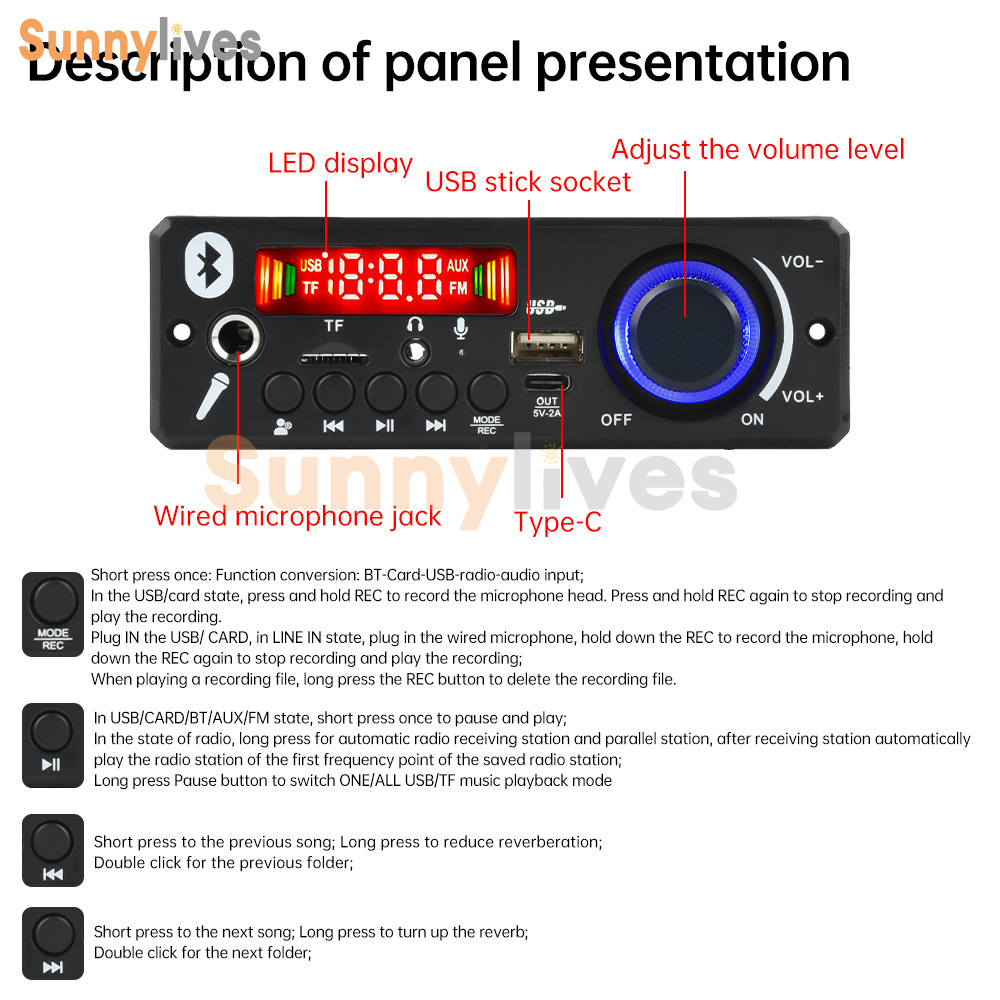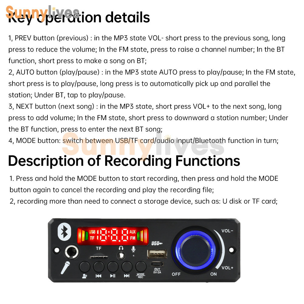 2.Support USB interface (U disk), support TF card interface, headphone function, key multi-directional control, backing vocals / VOL- / AUTO / VOL+ / MODE / translucent knob