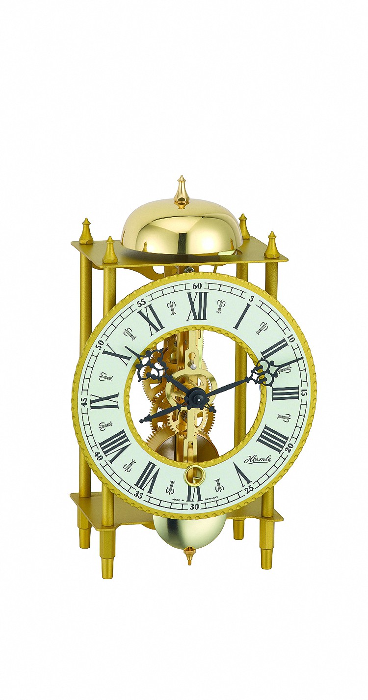 Table clock showing in retro style, an ideal combination out of classic and modern. German precision clockmaker quality since 1922 with highest accuracy in movements. Mechanical 14-day skeleton movement and passing bell strike on the hour.