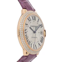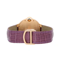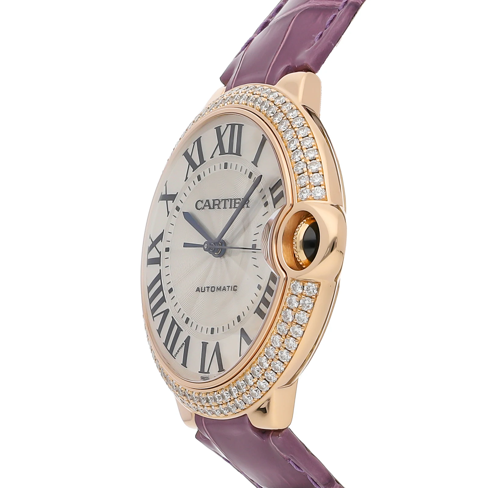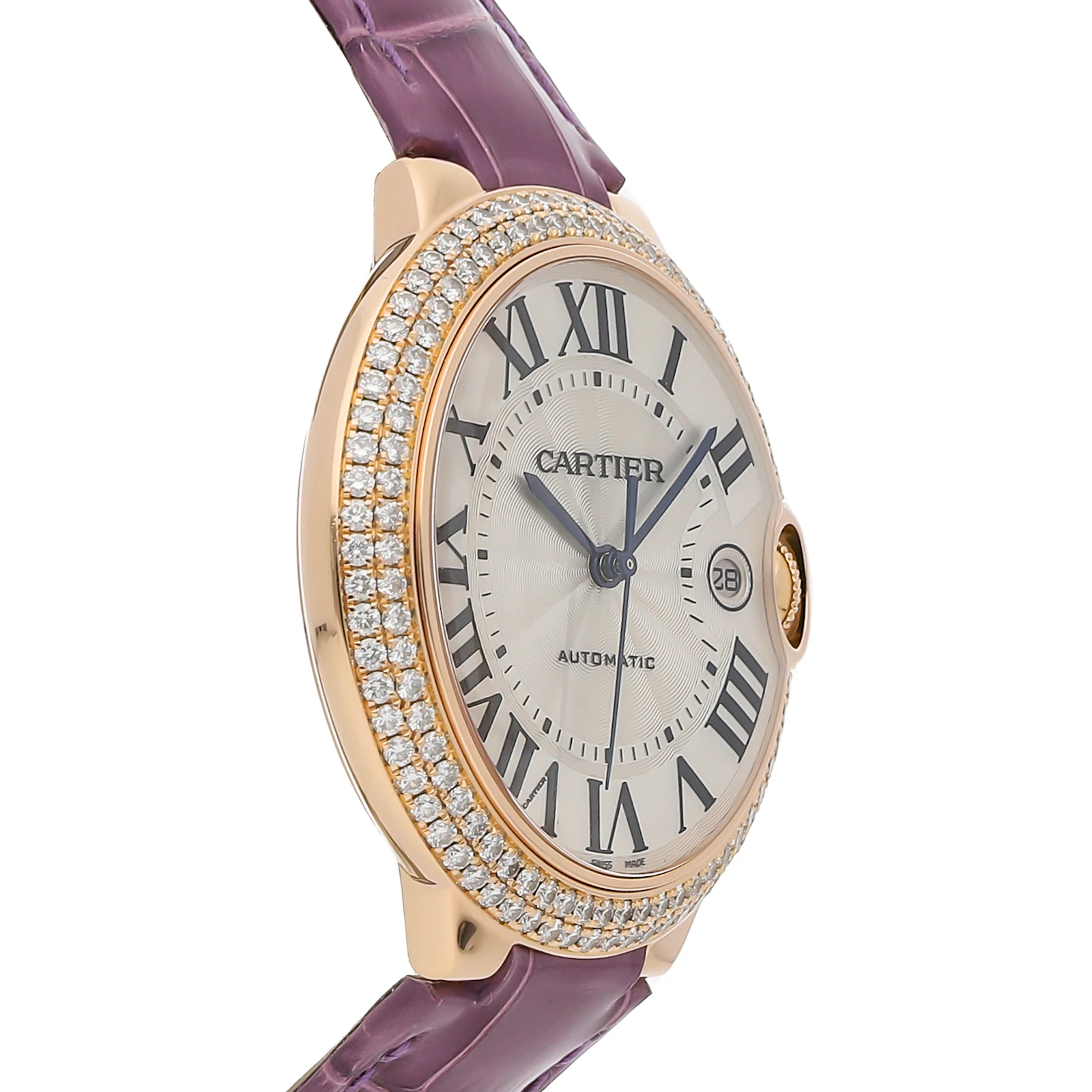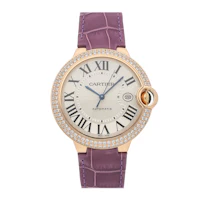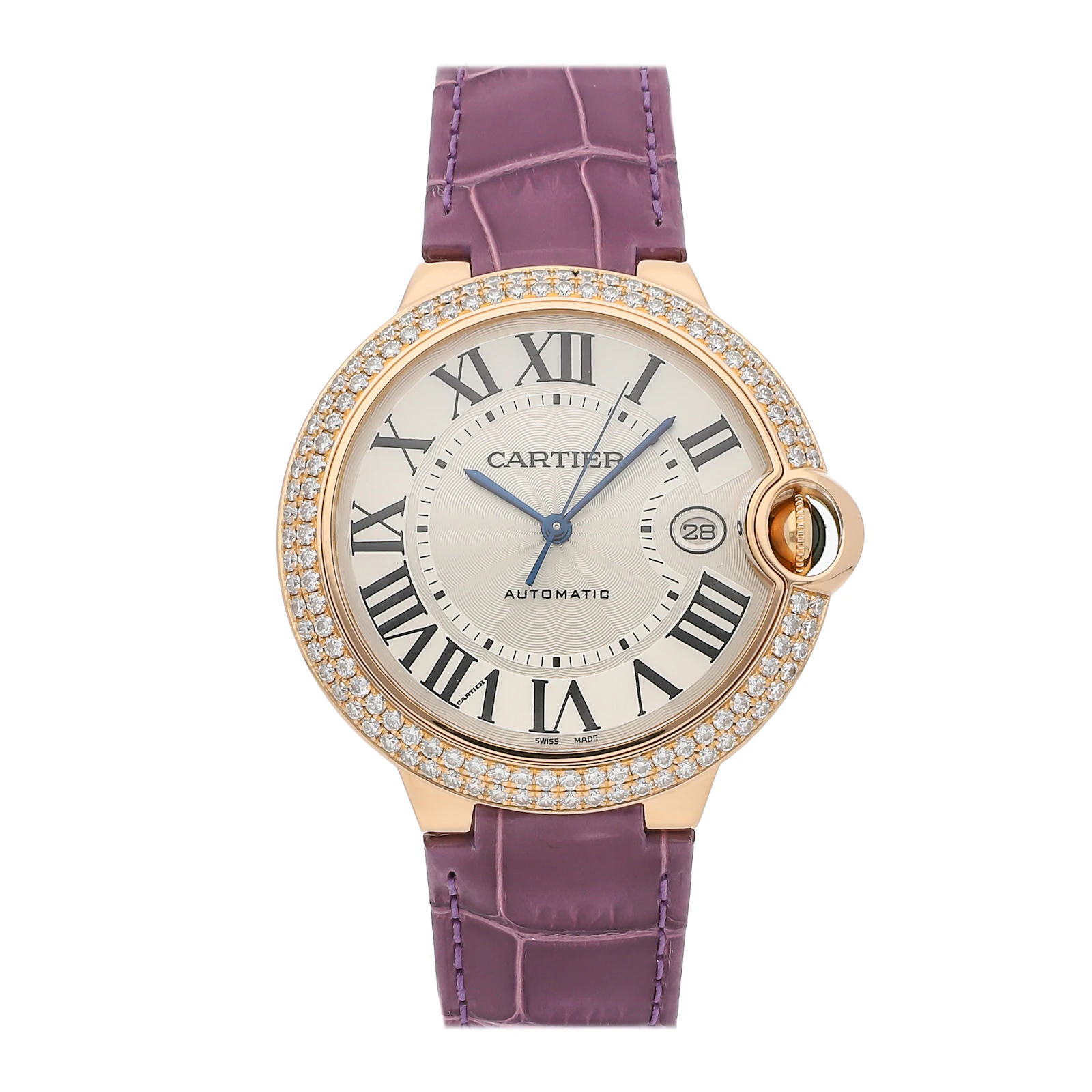 Pre-Owned Cartier Ballon Bleu (WE900851) self - winding automatic watch, features a 42mm 18k rose gold case with a 2 row diamond bezel surrounding a silver dial on a purple leather strap with an 18k rose gold deployant buckle. Functions include hours, minutes, seconds and date. This watch comes with the original box. We back this watch with a 2-Year warranty by The 1916 Company!