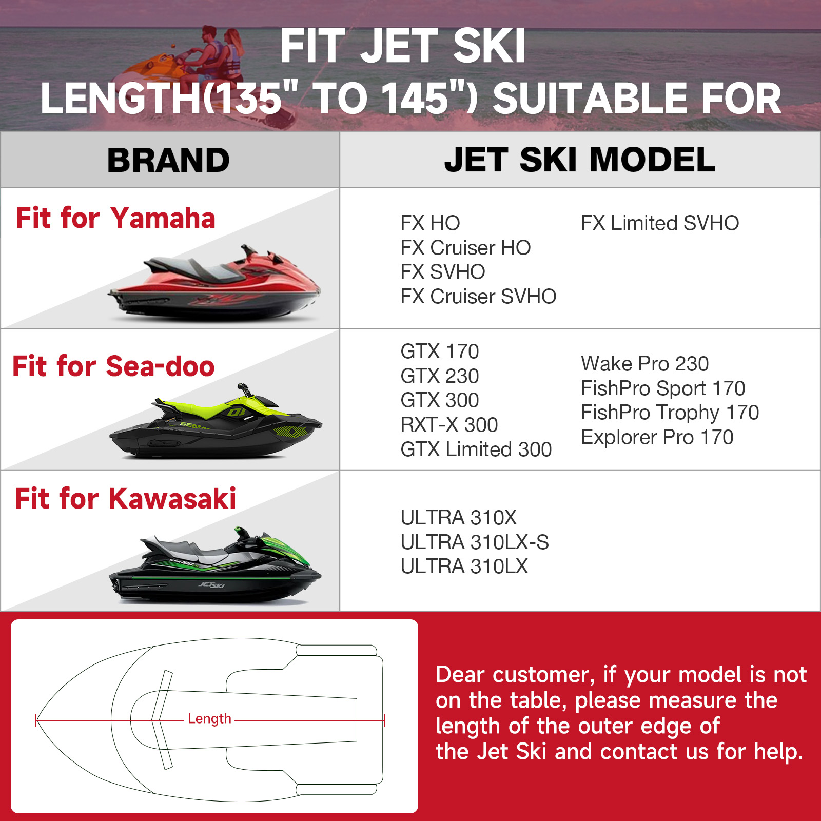 Answer: We offer a variety of sizes for our jet ski covers to accommodate different sizes and shapes of jet skis. If there is anything else you need, please contact us.