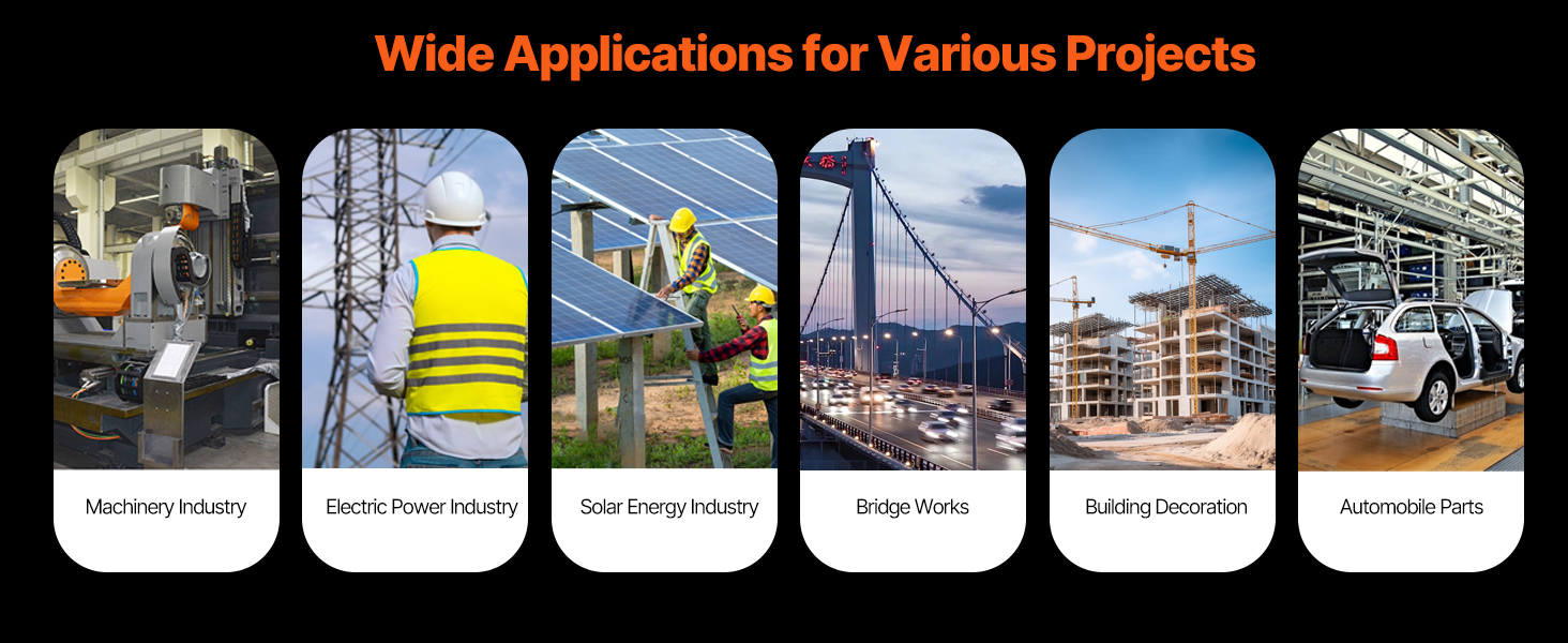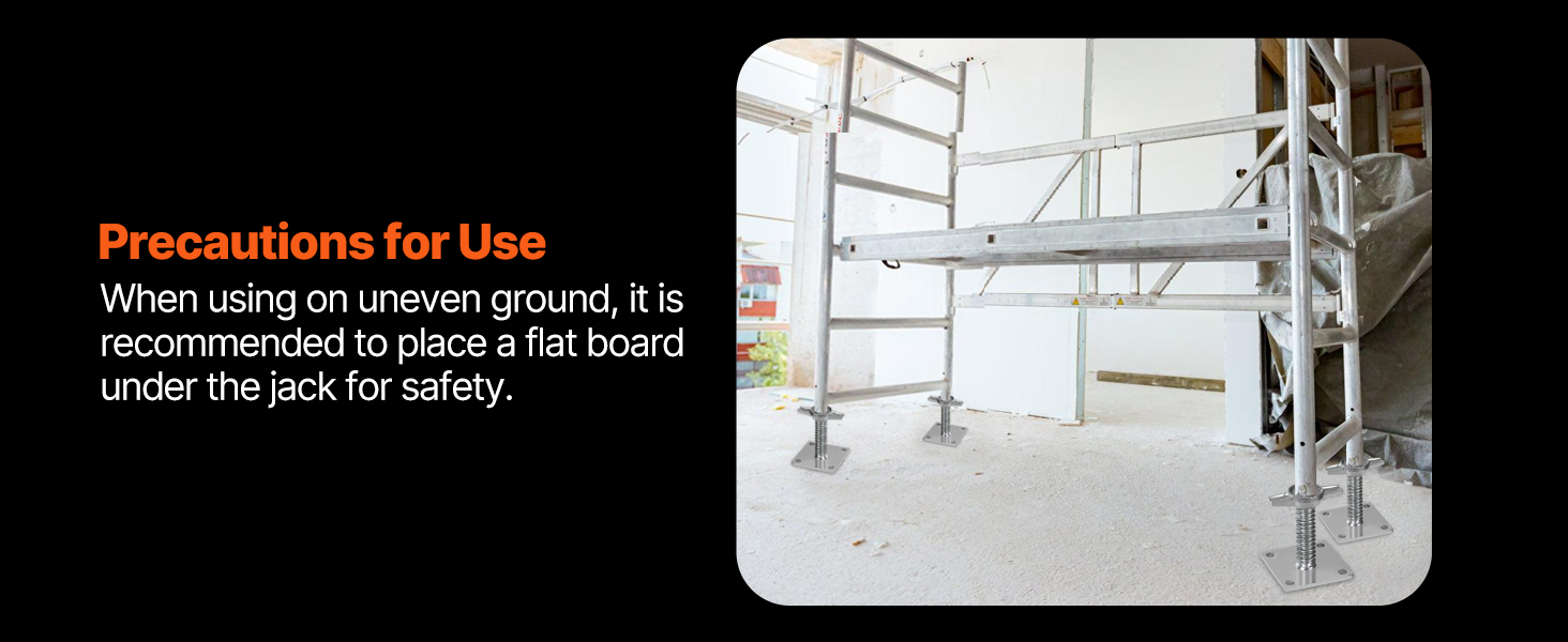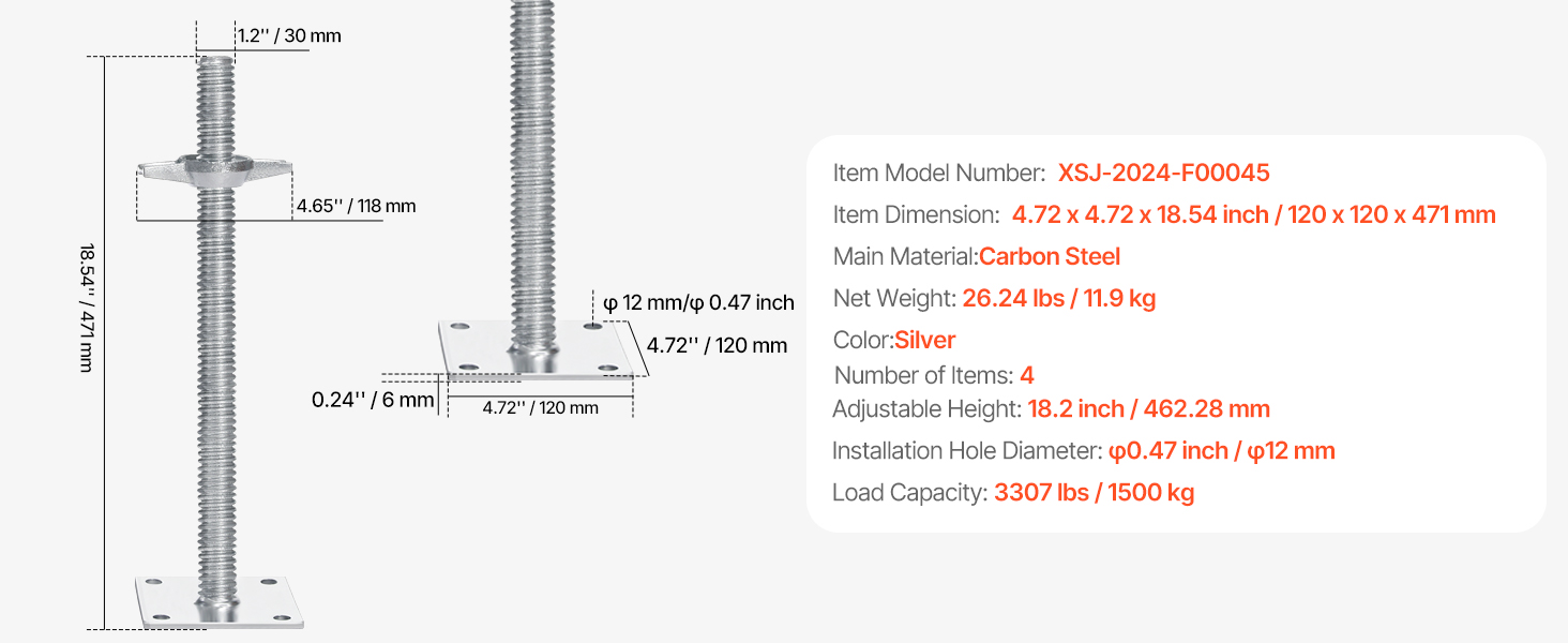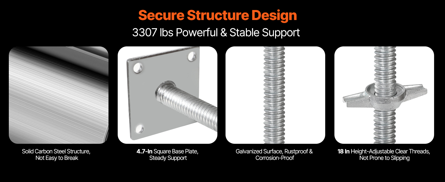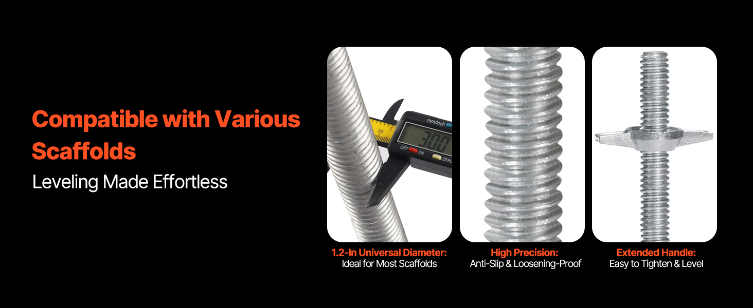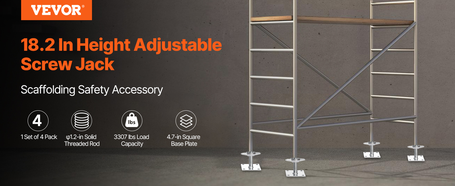 Our set of 4 leveling screw jacks serves as reliable scaffolding safety accessories with an 18.2" adjustable height, ideal for various scaffold setups and uneven ground. The solid threaded rod resists breakage for better stability, and the anti-rust coating avoids corrosion for lasting use.