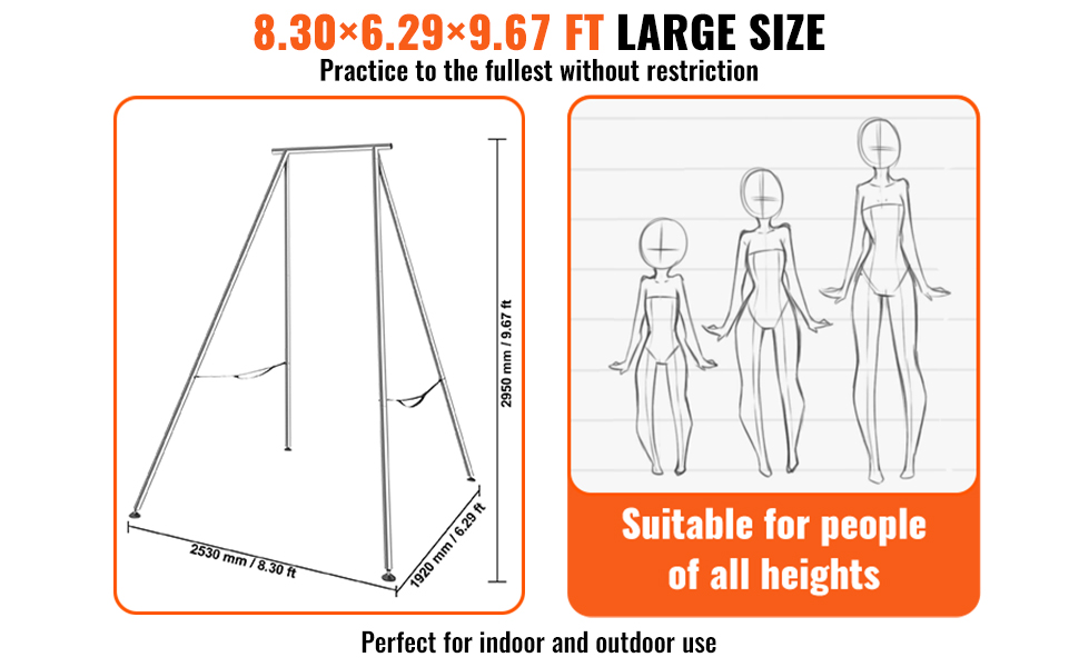 With generous dimensions of 8.30 x 6.3 x 9.68 ft, our yoga trapeze stand gives you room to breathe, stretch, and flow. It accommodates yogis of all heights, ensuring comfortable yoga sessions.