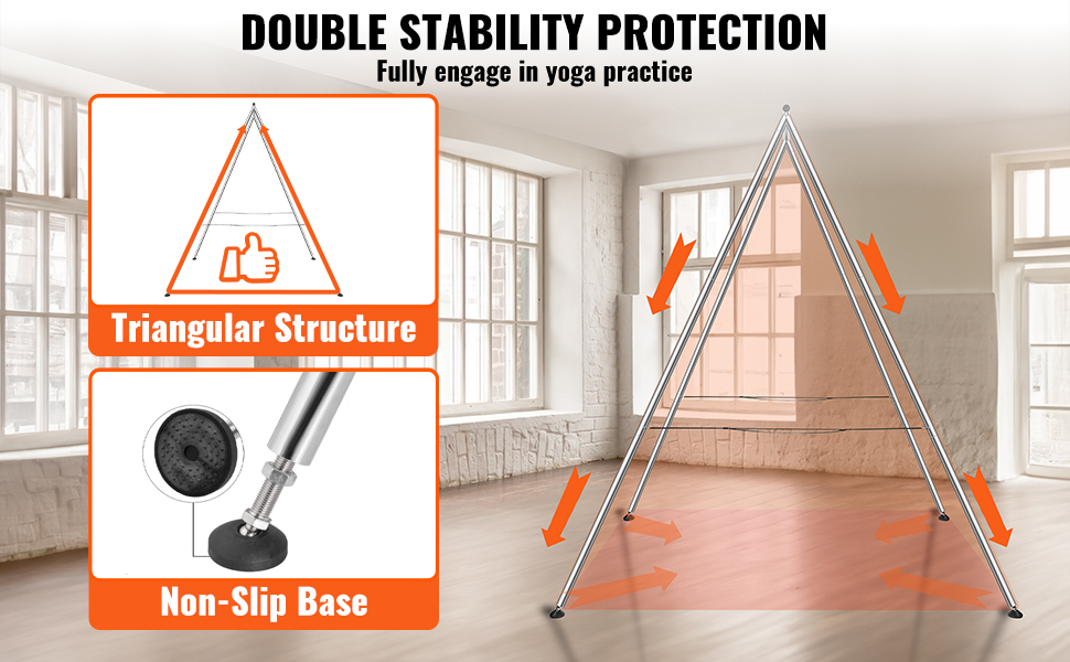 Double Protection: Our aerial yoga stand frame's clever triangular structure, combined with a non-slip base, ensures stability in all poses. Practice with peace of mind, focusing on your yoga journey without security concerns.