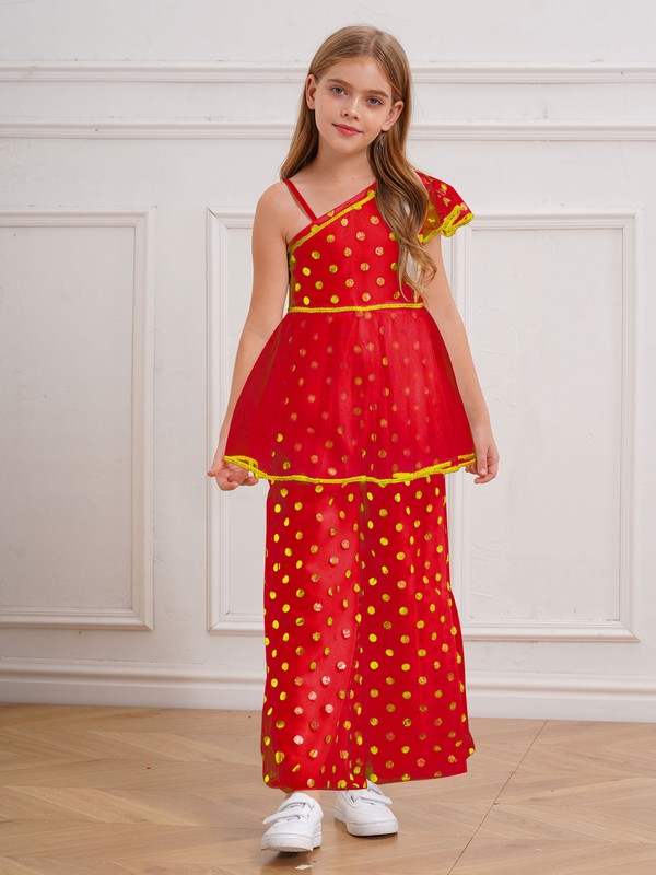 Sheer mesh top layer with metallic dots and peplum makes your child look elegant and beautiful.