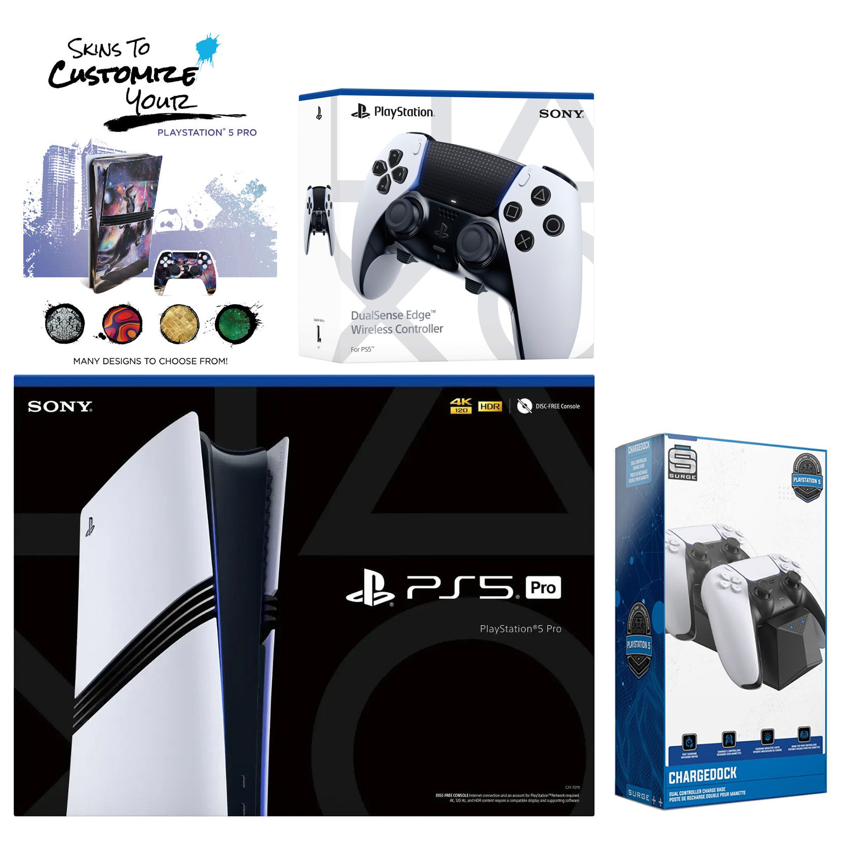 Sony PlayStation 5 Pro Console, 2x Dualsense Controllers, Dual Controller Charge Dock for Playstation 5, MightySkins Console + Controller Decal Code, HDMI cable, AC power cord, USB cable