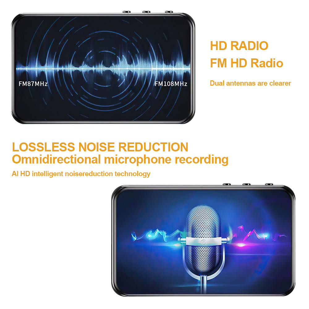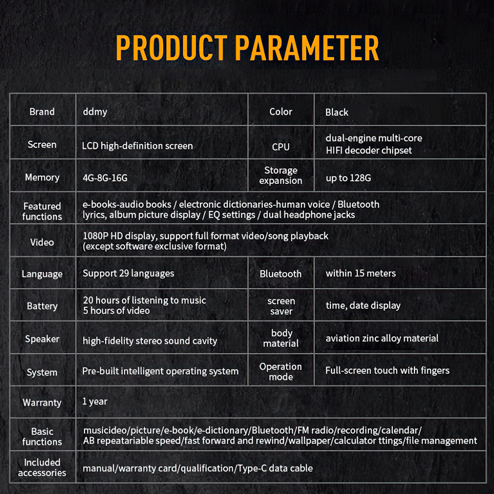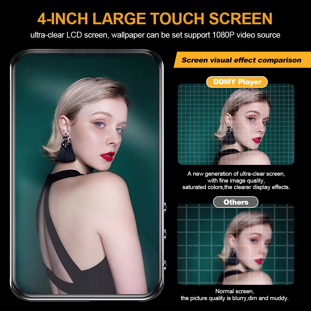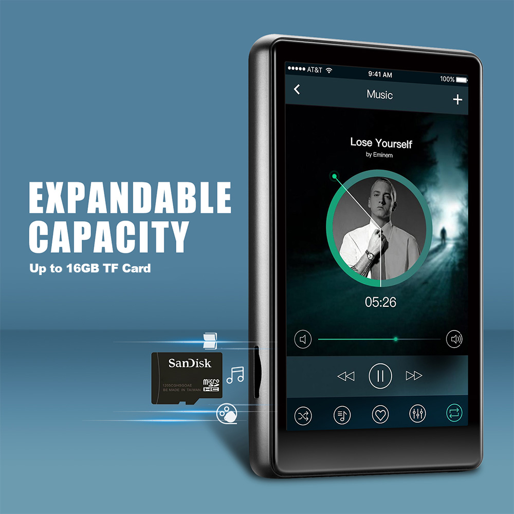Features: [Touch Full Screen] The 4.0-inch LED backlit wide-screen multi-touch display adopts IPS technology. The full-screen operation is simple, giving you a visual feast and a full touch interactive experience. [1080P Full-format HD] supports high-resolution video and direct playback without conversion, and supports RM, RMVB, AVI, MKV, WMV, VOB, MOV, FLV, ASF, DAT, MP4, 3GP, MPG, MPEG and other 1080P full-format HD video playback. [16GB and up to 256GB] Built-in 16GB memory, supporting TF card up to 256GB (this product is not included in the package). You can download thousands of songs and store a large number of files, supporting music formats such as MP3 WMA APEFAC WAVAAAC-LCACELP. [Excellent Sound Quality] Provides Hifi sound quality close to the original sound, supports most audio formats, and the perfect sound quality makes it a necessary equipment for enthusiastic listeners, making work and life more enjoyable. [Multifunction] Support music playing, video playing, recording, electronic dictionary, text document TXT reading, picture browsing, FM radio, folder function, TF card and setting function. [Fast charging] 1000mAh high-capacity lithium-ion battery and Type-C fast charging technology are adopted, and MP3 player has a type-c charging cable. Newly upgraded Bluetooth 5.0, including high-fidelity lossless audio/video/multimedia playback, built-in speaker /FM radio/recorder and other functions, especially designed for sports, travel, work, etc., suitable for a variety of usage scenarios. Specification: Project type: MP3 player Materials: metals and electronics Screen: 4.0-inch HD screen Resolution: 480*800 Headphone interface: standard 3.5mm round hole. Body storage space: 16GB Memory card slot: supports 32, 64, 128 and 256GB memory expansion (not included). Bluetooth: 5.0 Support: MP3, OGG, APE, FLAC, WMA, WAV, AAC. Photo format: JPEG, BMP, GIF, PNG. Product size: 103*63*10mm E-book: TXT Battery type: built-in 1000mAh lithium-ion battery Additional functions: support for Bluetooth, picture browsing, FM radio, recording, playback and e-book reading. Packing list: 1 * MP3 1* wired headset 1 * Charging cable 1* User Manual