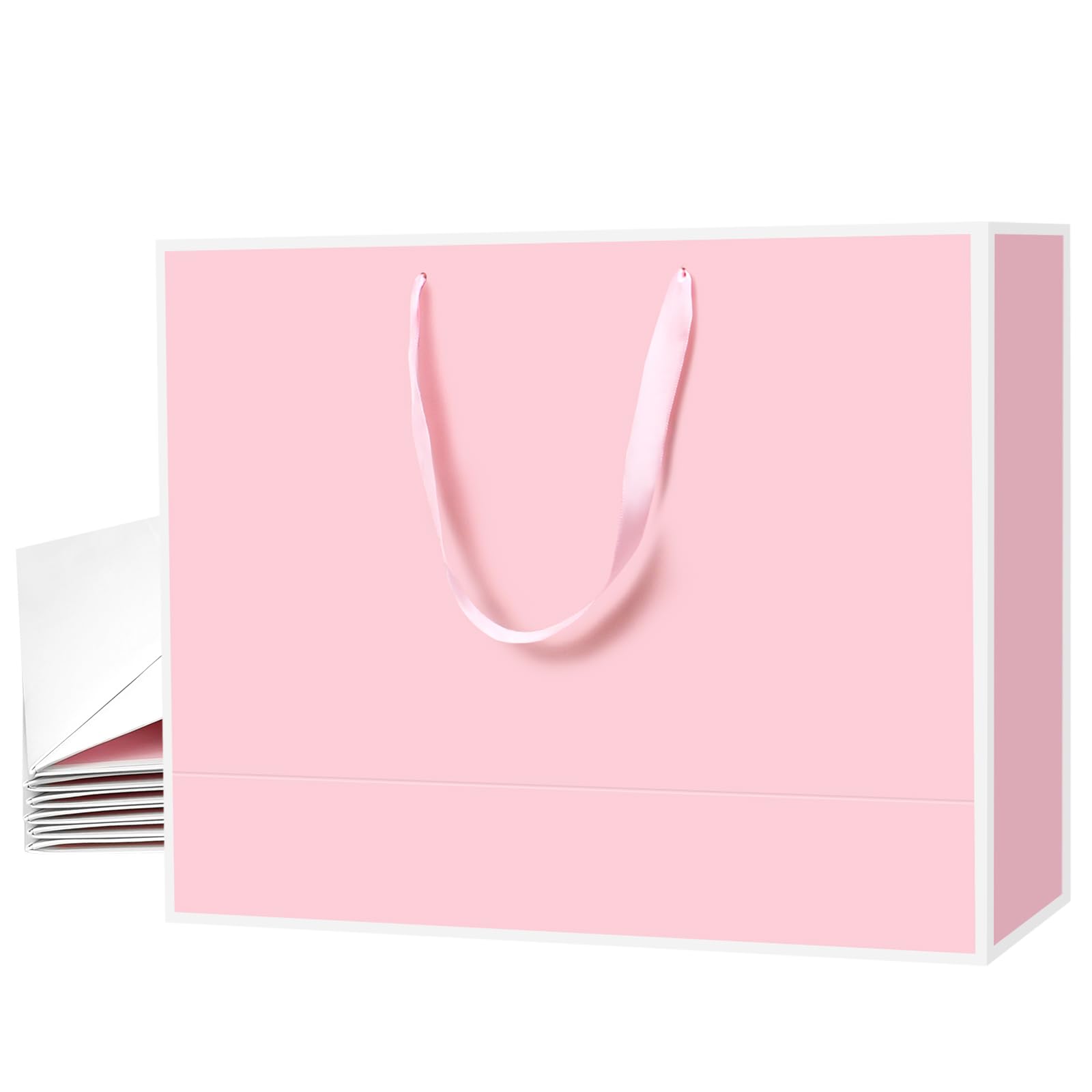 Color:Pink with White Border Quantity: 6pcs Extra Large Gift Bags Size: 17“Lx5.5”Wx12.6“H Unique design: 1. The bottom is reinforced and flat, sturdy and durable, and easy to tear 2. Reusable and recyclable 3. The widened ribbon handle is stronger, more beautiful, and more comfortable to use Multiple uses: 1. As a gift bag for birthdays, weddings, Christmas, and other parties 2. It is suitable for shopping bags in retail, commodity, commercial, and supermarkets 3. Storage bags for winter clothing,kitchens, restaurants, and food storage rooms