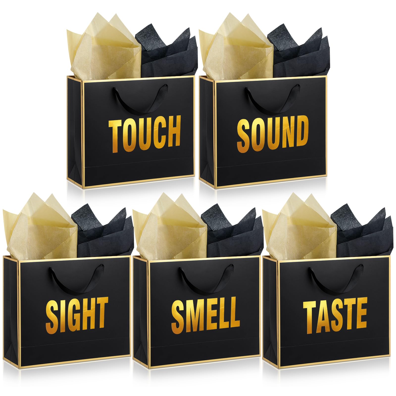Features: Handle Design for Easy Carrying: The 5 senses gift bags are designed with widened, ribbon tied handles. They provide a comfortable grip and enable easy carrying, even when the bags are filled with heavy items. These features considerably enhance the practicality of these gift bags with handles bulk. Sturdy Material: The metallic paper gift bags with tissue paper is mainly made of cardboard material, which is strong and sturdy and can provide you with long term service. Specifications: Material: paper Color: black, gold Size: Gift bags: about 11.8 x 10 x 4 inches/ 30 x 25 x 10 cm Tissue papers: 550x660mm Package : 5 x Black and gold gift bags 5 x Gold tissue papers 5 x Black tissue papers Notes: Manual measurement, please allow slight errors on size. The color may exist a slight difference due to different screen displays.
