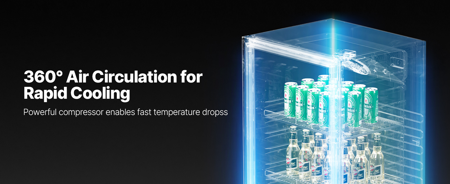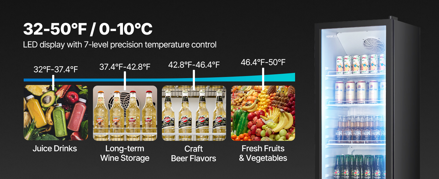 - Fast Cooling: Our beverage refrigerator cooler merchandiser boasts a powerful compressor and 7-level temperature control (32ºF-50ºF / 0℃-10℃). With an air cooling system, it ensures uniform cooling, chilling your drinks in 45 minutes