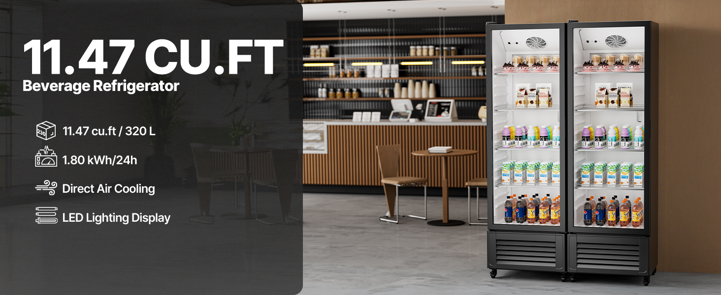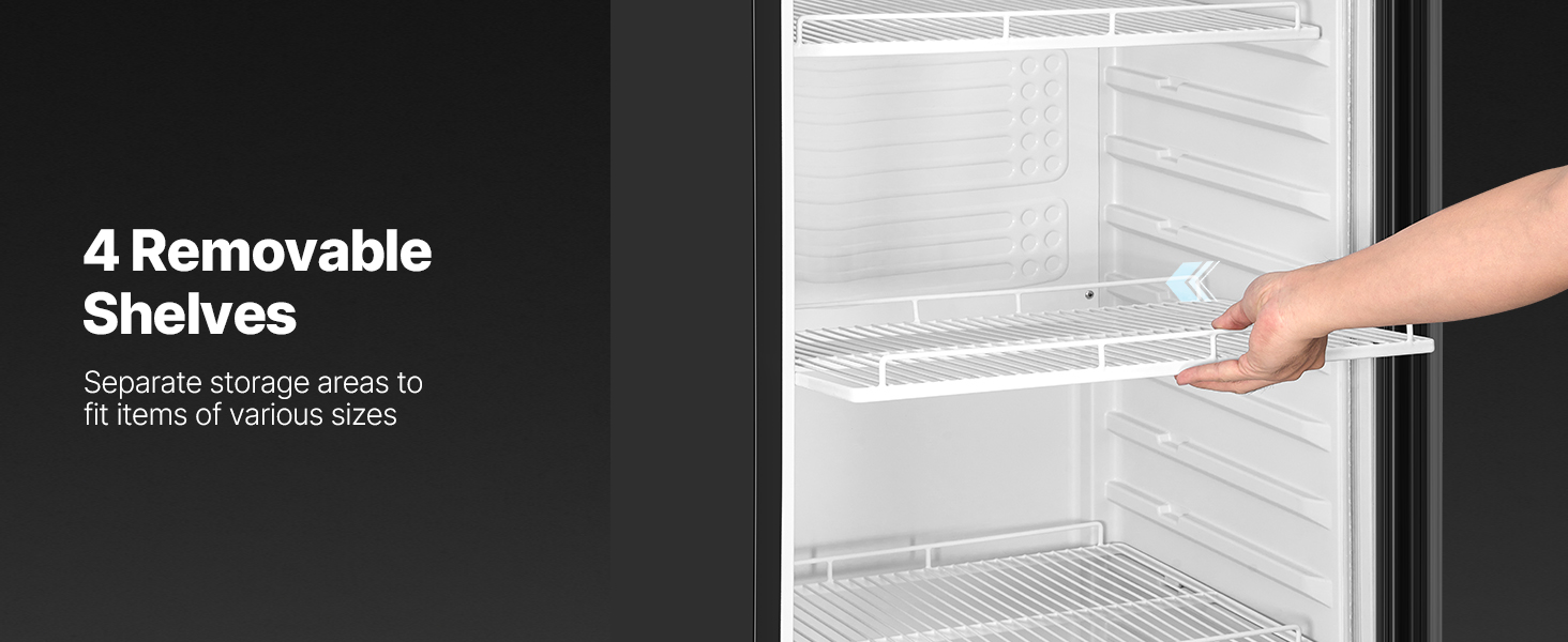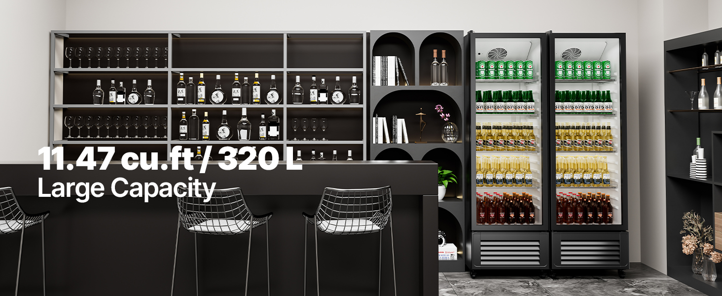 - 11.47 cu.ft / 320 L Large Capacity: Our commercial display refrigerator merchandiser comes with 4 adjustable shelves and multiple fixed slots for easy customization of the interior space. The 11.47 cu.ft / 320 L capacity is excellent for storing beverages in various sizes