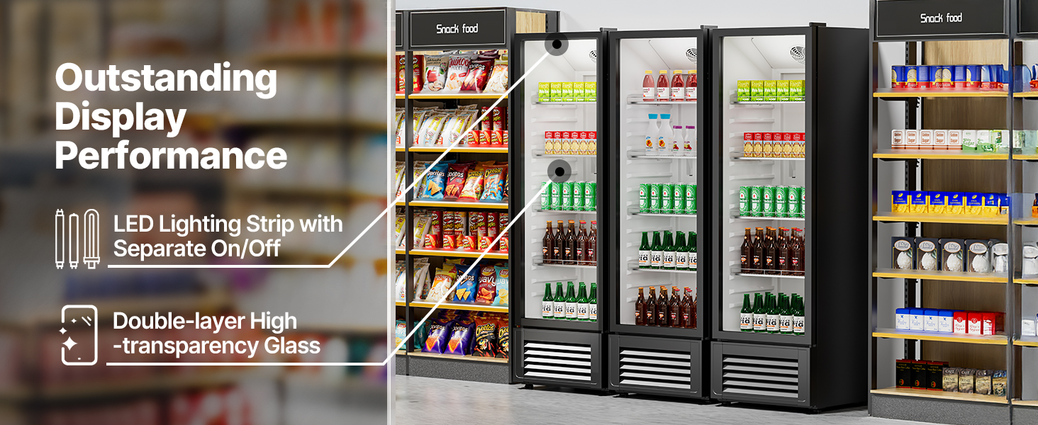 - Exceptional Display Performance: Our commercial merchandiser refrigerator delivers double-layer high-transparency glass that keeps out external heat while letting you see the inside without opening the door. Plus, the LED lighting with an independent switch creates an eye-catching lighting experience, showcasing your beverages beautifully. Note: Please let the unit rest for at least 6 hours and then power on after receiving it