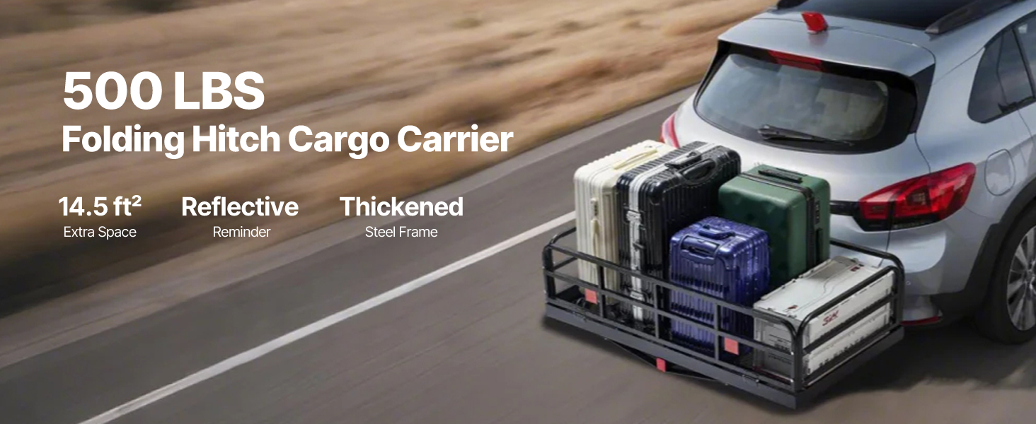 500lbs Extra Storage Space: Our hitch cargo carrier measures 60 x 24 x 14 in/1525 x 610 x 355 mm, which can be used to load different sizes of cargo. Save storage space for your car transport.