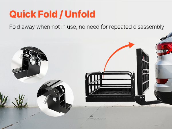 Foldable: When you don't use our hitch cargo carrier,, the luggage frame can be completely flattened and folded 90°by adjusting the pins and latches, lowering the need for repeated disassembly and taking up no extra space.