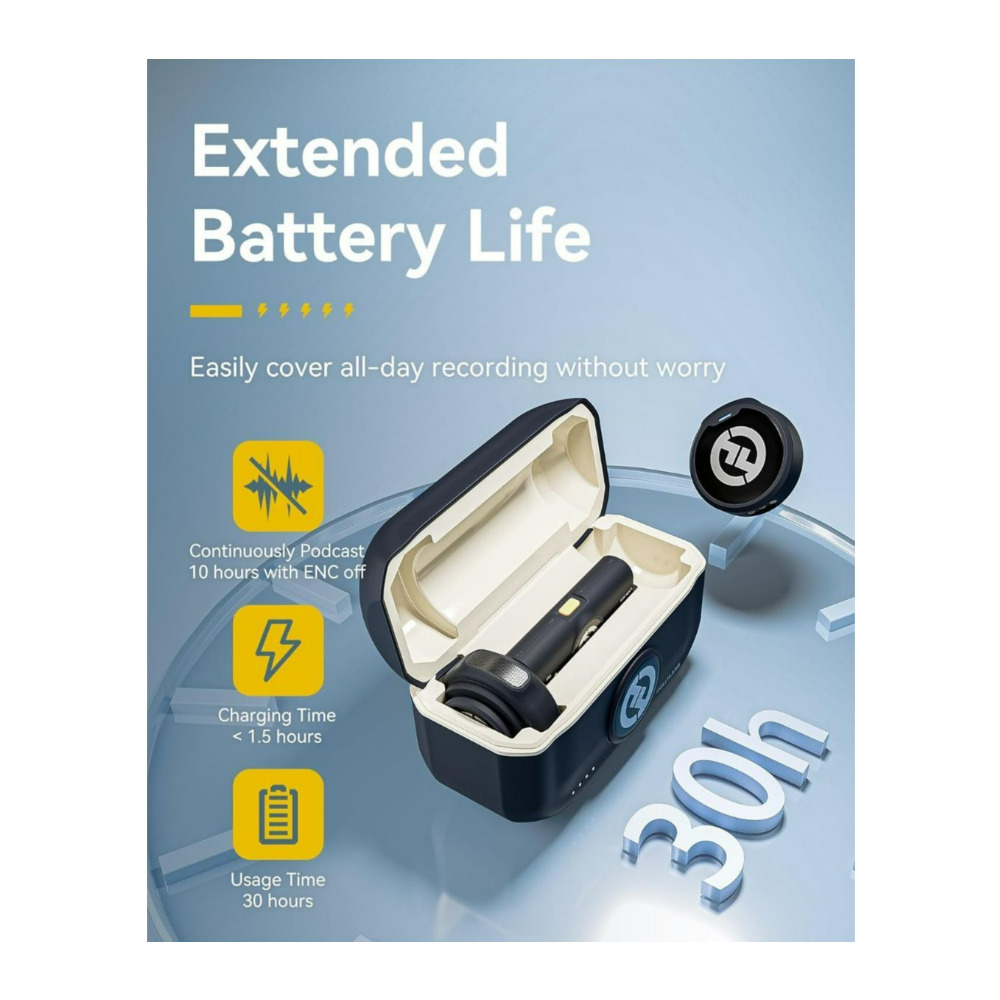 With optimized power efficiency, the LARK M2 wireless microphone can work for up to 10 hours (with ENC off). The compact charging case can fully charge the entire set twice, and each charge takes less than 1.5 hours. With the charging case, the mobile version has a battery life of 30 hours. No more worrying about the low battery situation.