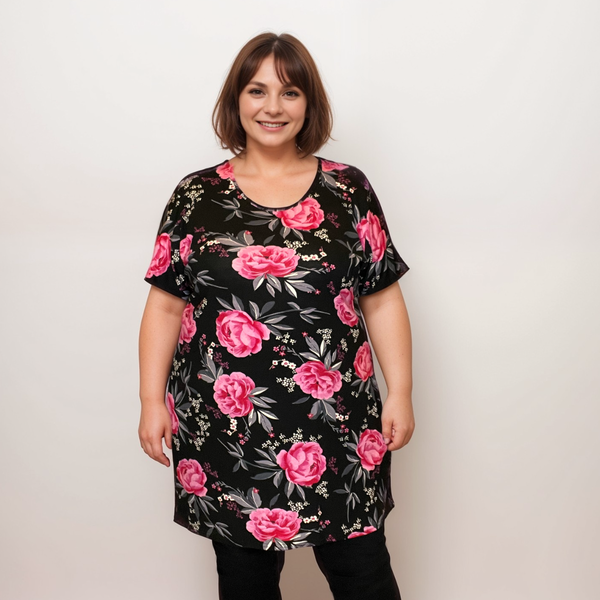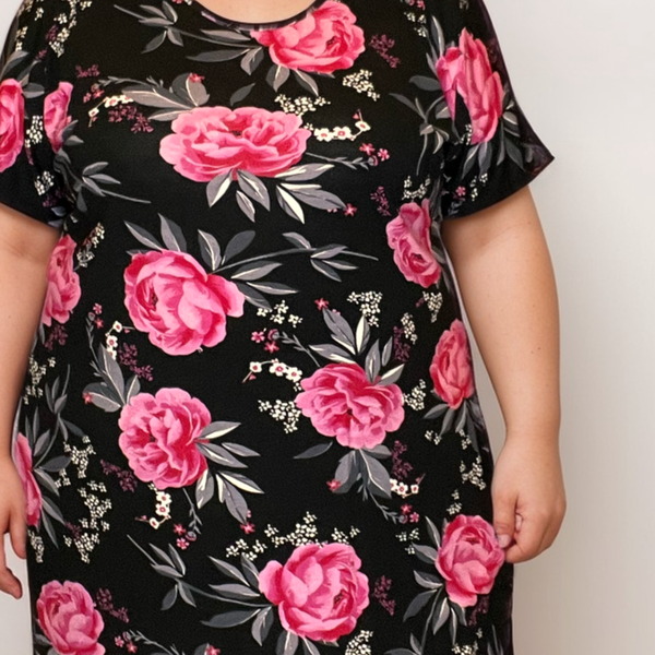 Experience comfort and style with ROCKTHOSECURVES BLACK PINK ROSES LONG T-SHIRT! Our super soft and stretchy fabric is perfect for plus size t-shirt tops that will make you feel great. Upgrade your wardrobe with this essential piece from Rockthosecurves!