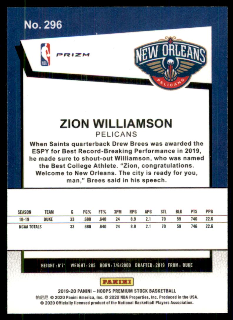 2019-20 Hoops Premium Stock Prizms Silver #296 Zion Williamson Rookie RC Card