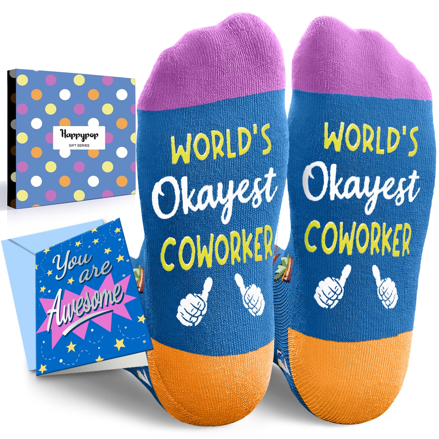 • FUNNY OFFICE SOCKS: These socks are adorned with champagne, trophies, and computers, and feature "WORLD'S Okayest COWORKER" woven into the soles. The simple design offers affirmations and encouragement for coworkers.