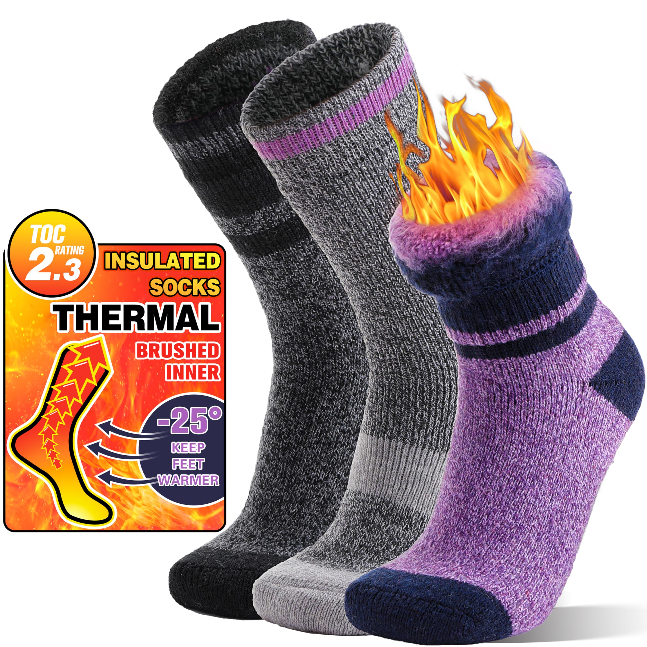 - 【Premium Thermal Material】Made of 92% Acrylic, 7% Polyester, 1% Spandex, thermal winter socks socks have thick layers and warm brushed inner, which keep feet more comfortable and no itching issues .There are 3 pairs warm winter socks in one pack for men & women.