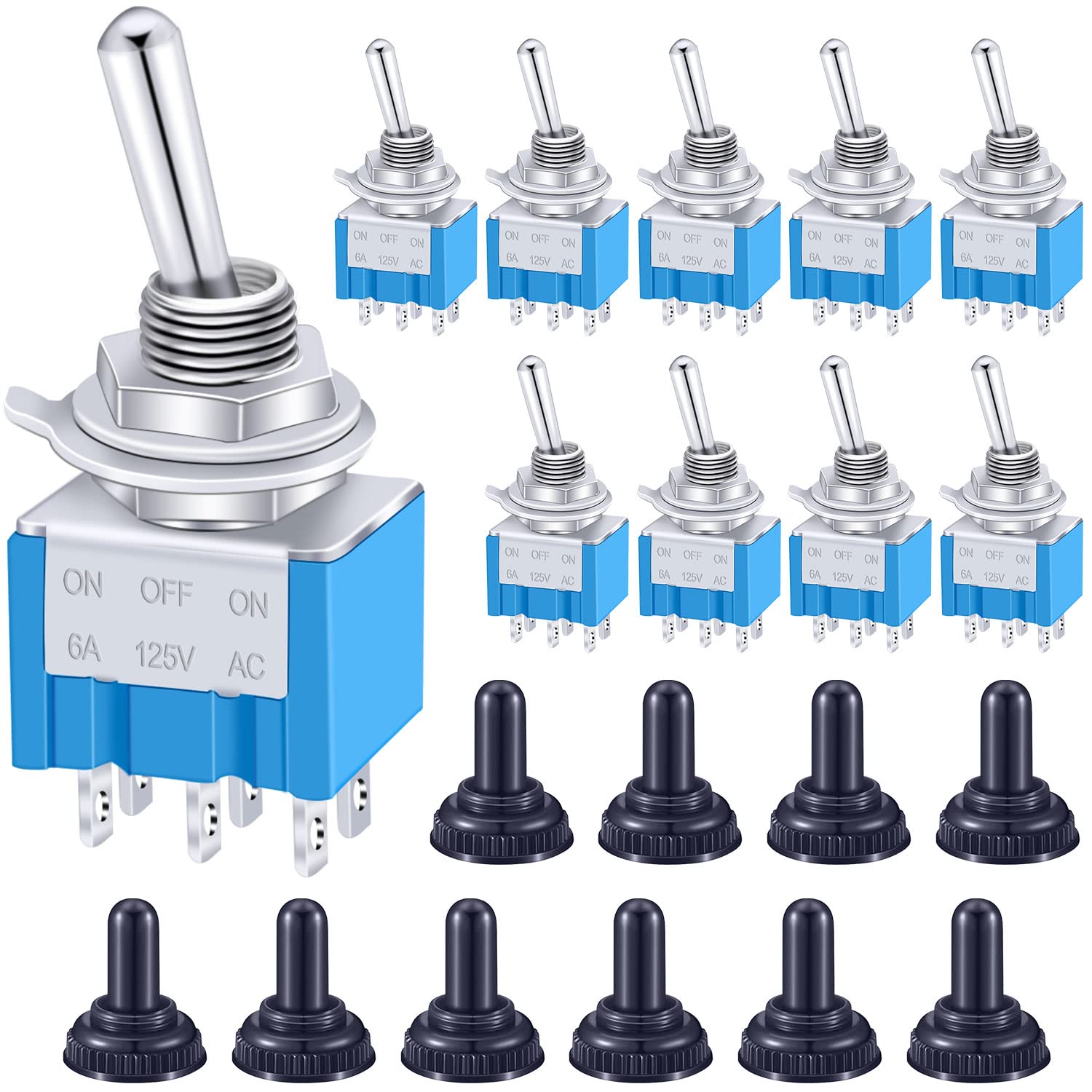 Taiss 10 pezzi Mini Interruttore a levetta ON-OFF-ON 3 Posizioni 6 Pin DPDT Metallo Interruttore a Bilanciere a levetta 6A 125V AC Blu con Cappuccio Impermeabile per Automobile,casa MTS-203-MZ