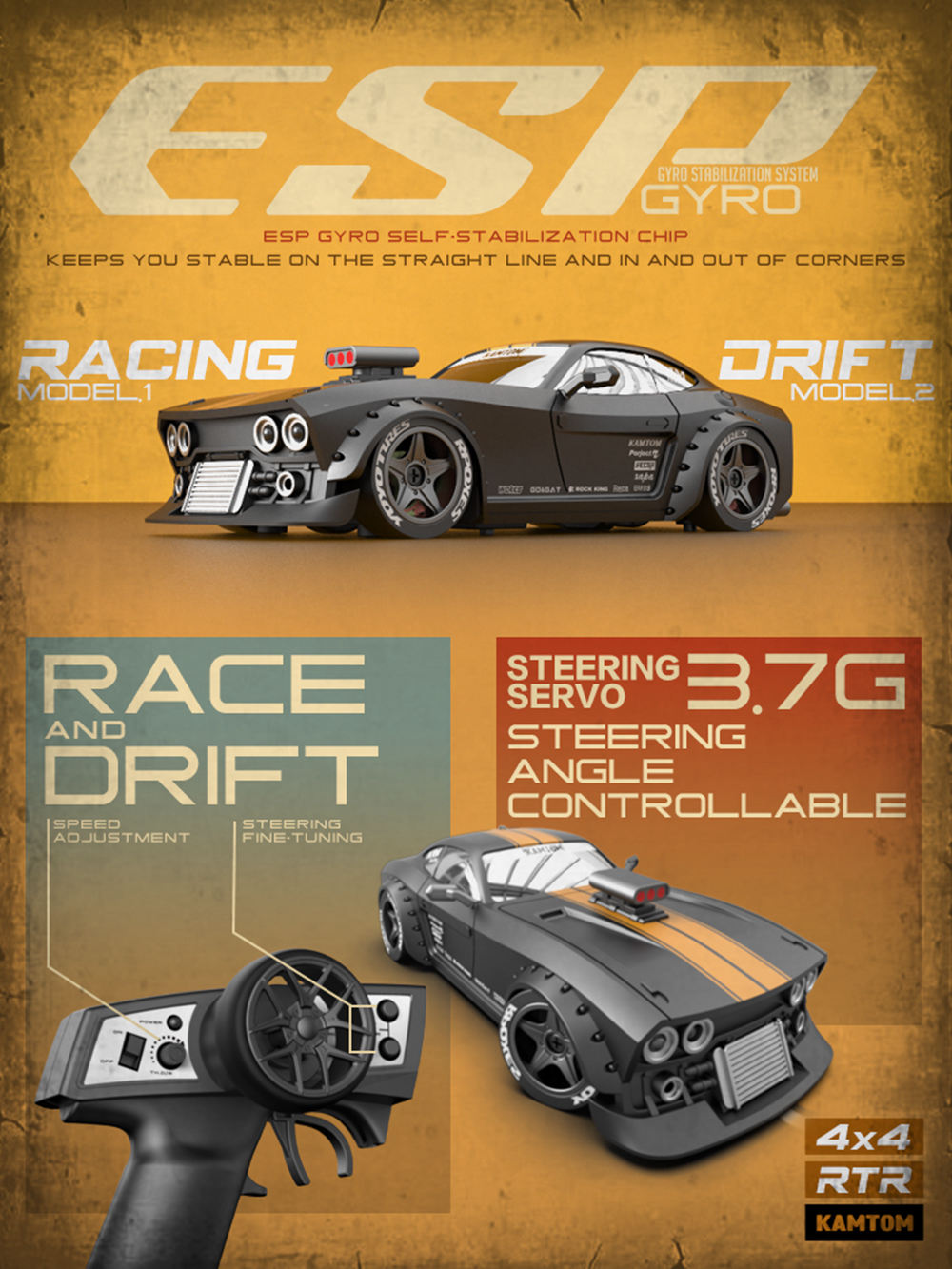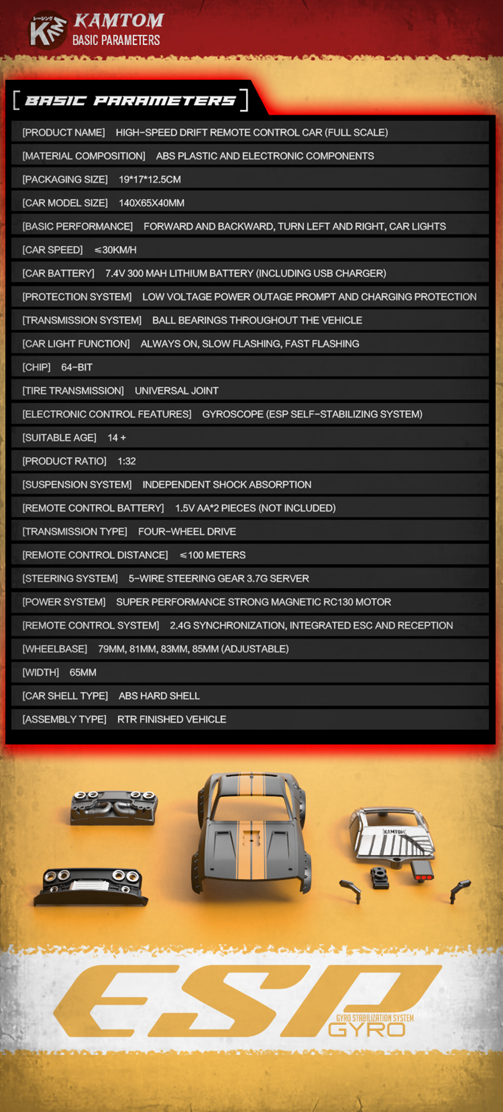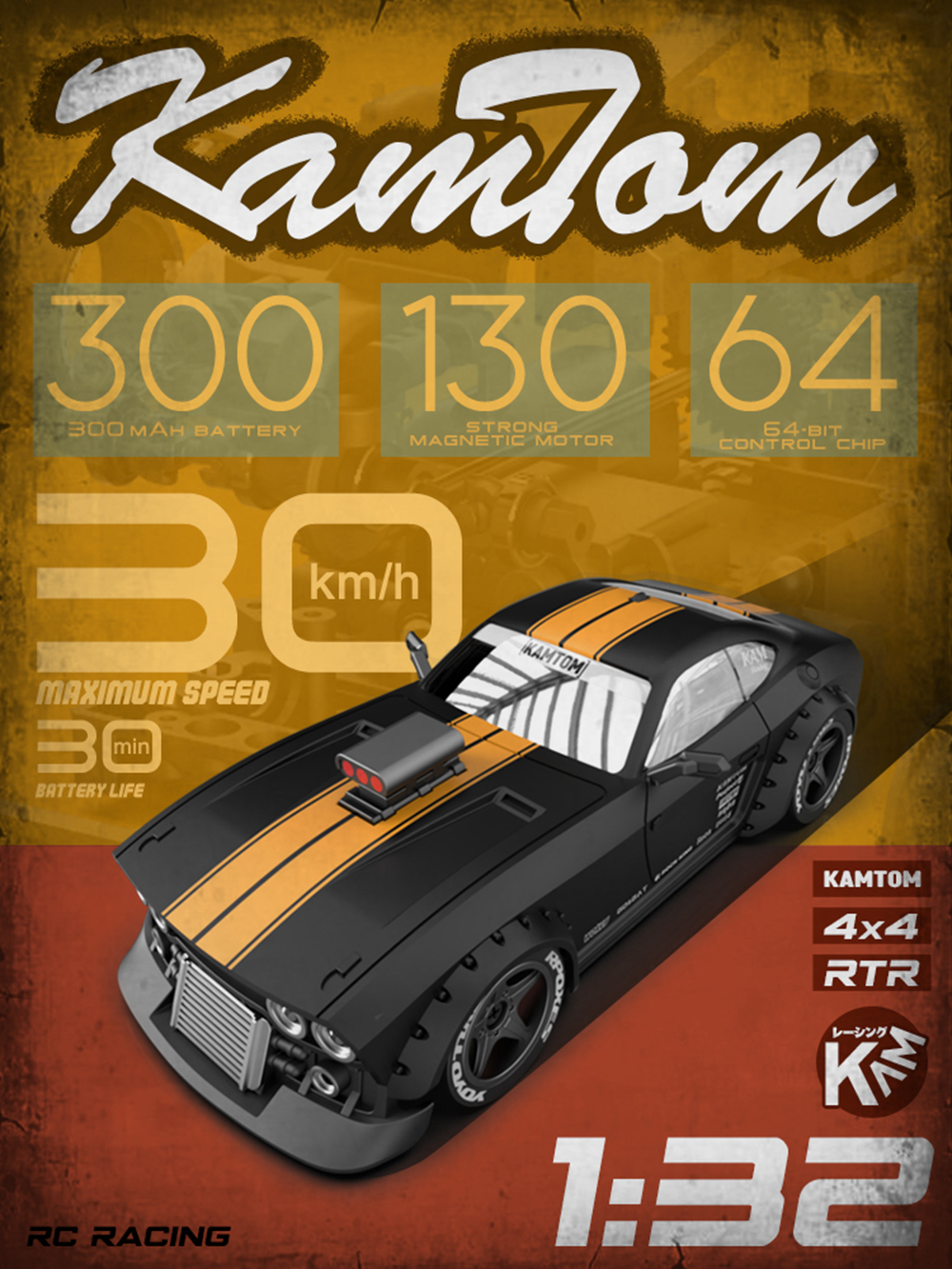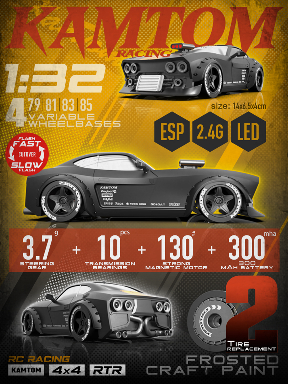 Kamtom 1/32 RC Four-Wheel Drive Toy Car,There are two kinds of tires can be replaced,with ESP gyroscope stabilizer chip, 79mm/81mm/83mm/85mm, 4 variable wheelbases, This RC racing car is great for relaxing fun.