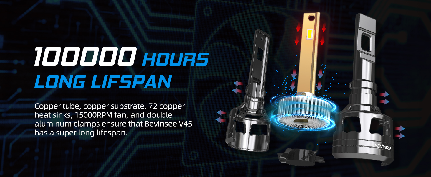 V45 Series LED Headlights comes with our core tech industry-leading VC cooling system. Prove effective in sweeping away the heat, designed with Copper Substrate +Copper Tube + Aluminum Double Clamp + 72 Heat Sinks + 15000 RPM Mute & Powerful Fan, making your headlight 100% bright as possible.