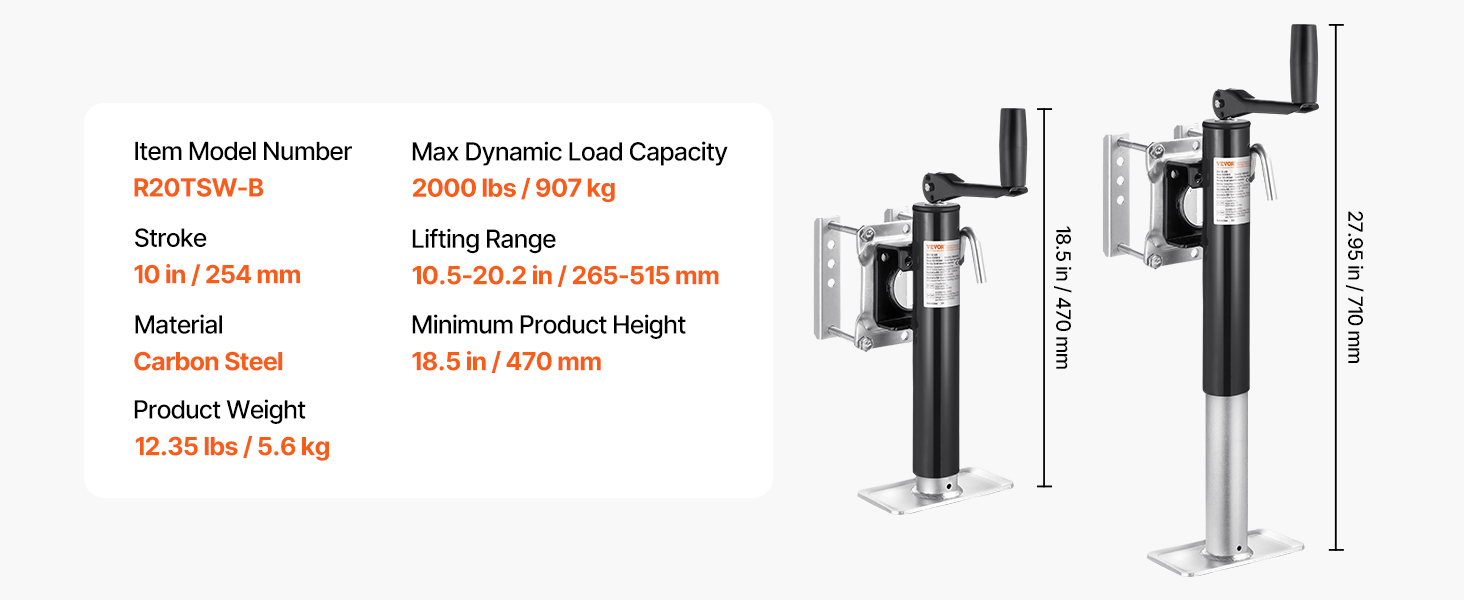 Heavy-Duty Load Capacity: The trailer jack boasts an impressive lifting capacity of 2000 lbs, making it a powerful tool for lifting tasks. With a lifting range of 10.5 to 20.2 inches, it fits both high-profile and low-profile trailers.