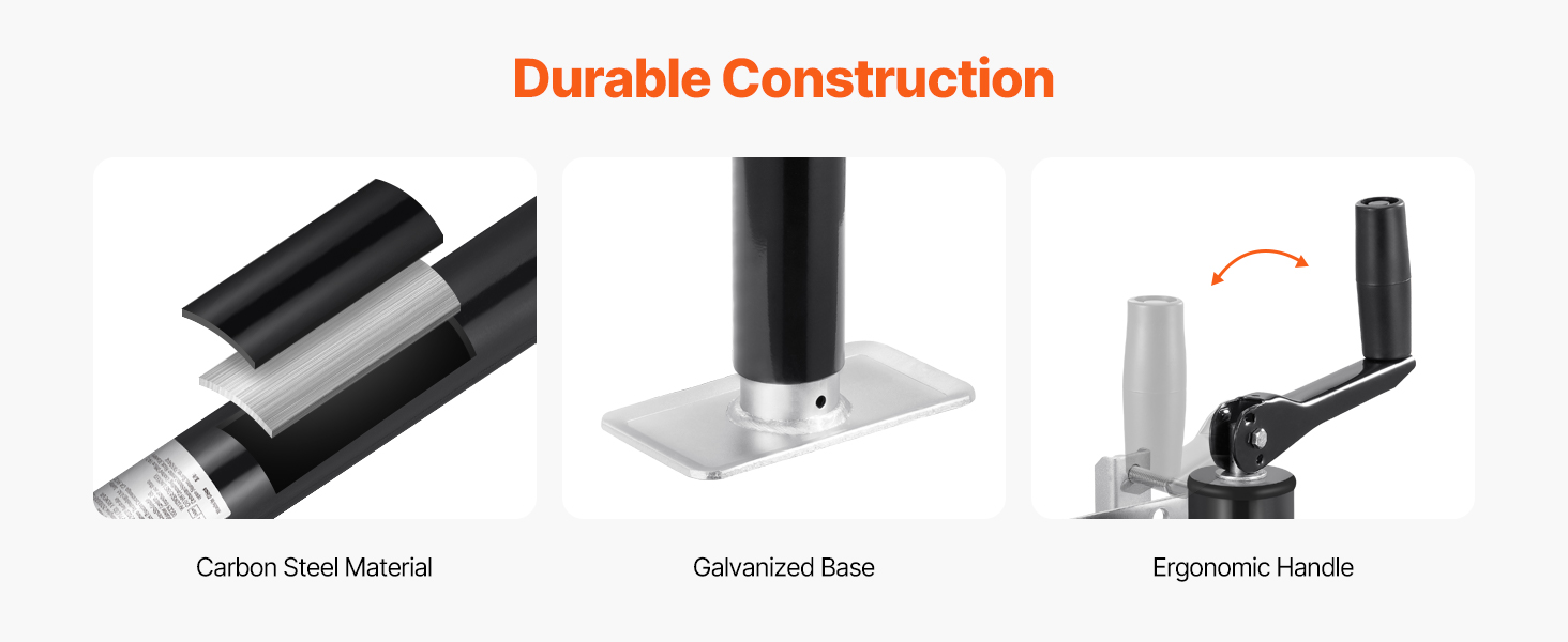 Reliable and Durable: This trailer tongue jack is made of tough carbon steel with a rust-resistant, galvanized finish. It's ready for anything, standing up to all kinds of environments without giving in to rust.