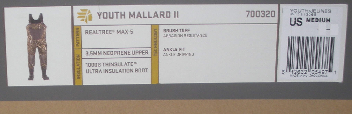 Lacrosse 700320M-6 Boys Youth 3.5mm Neoprene 1000G Mallard 2 Wader 3.5mm stretch insulating neoprene Uncompromising waterproof protection Abrasion resistant protection from LaCrosse Brush Tuff bi-directional material Buckled straps with capabilities to create a belt when folded down Top loading pocket and hand warmer Double stitched seams and reinforced knees 1000G Thinsulate Ultra Insulation boot Removable EVA footbed Swamp-Lite outsole for superior traction in snow, mud and loose terrain Color Realtree Max-5 camouflage 28" Inseam 47" Outseam 39" Chest 38" Waist Size 6 |