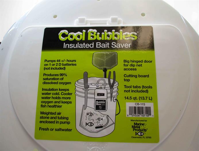 Cool Bubbles 5 Gal Insulated w/B-11 Pump Helps maintain constant a water temperature with proper aeration Noncorrosive HDPE plastic pail and lid for durability Foam liner offers optimal insulation Multipurpose lid with a cutting board top features a large door for easy dip net access Holds 5 gallons Includes an air pump that runs up to 40 hours on 2 alkaline D batteries (not included) Waterproof switch |