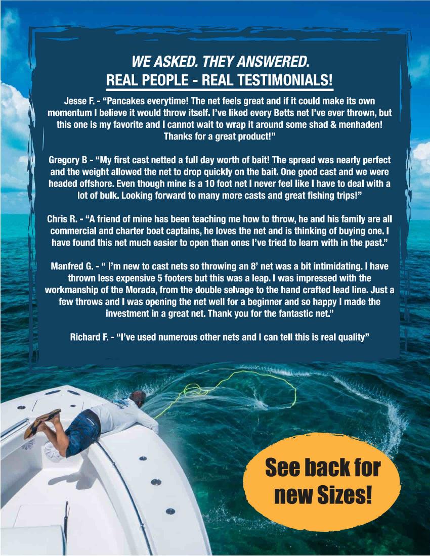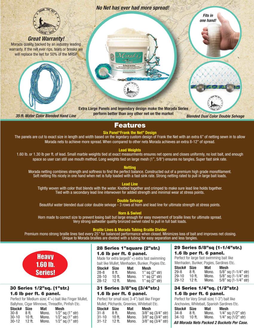 - 1.6 Lbs per radius foot of small marble size lead weights on 3/8" mesh nets tied at exact measurements ensures no tangles and a super fast sink rate