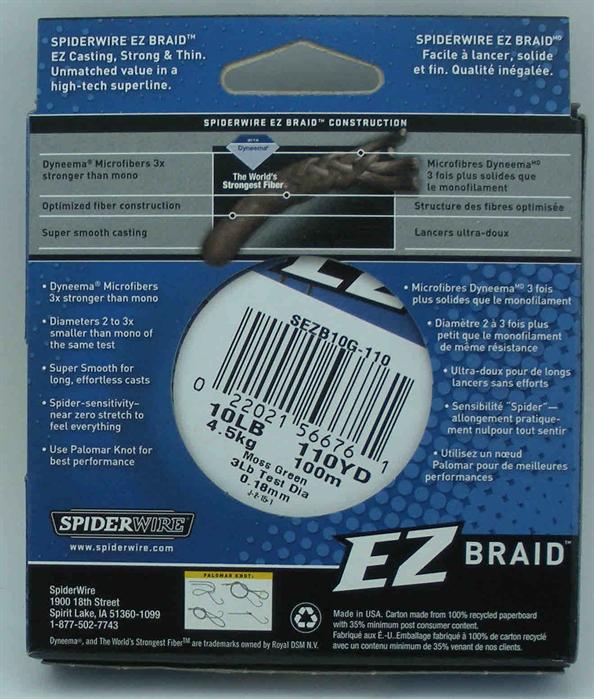 Spiderwire 1140561 SEZB10G-110 EZ Braid Line 10 Lb Test 110 Yard Spool Super smooth for long effortless casts Spider sensitivity, near 0 stretch Dyneema microfibers 3x stronger than monofilament Color-Moss Green |