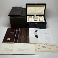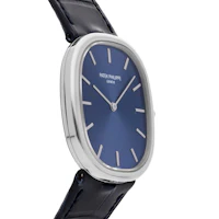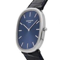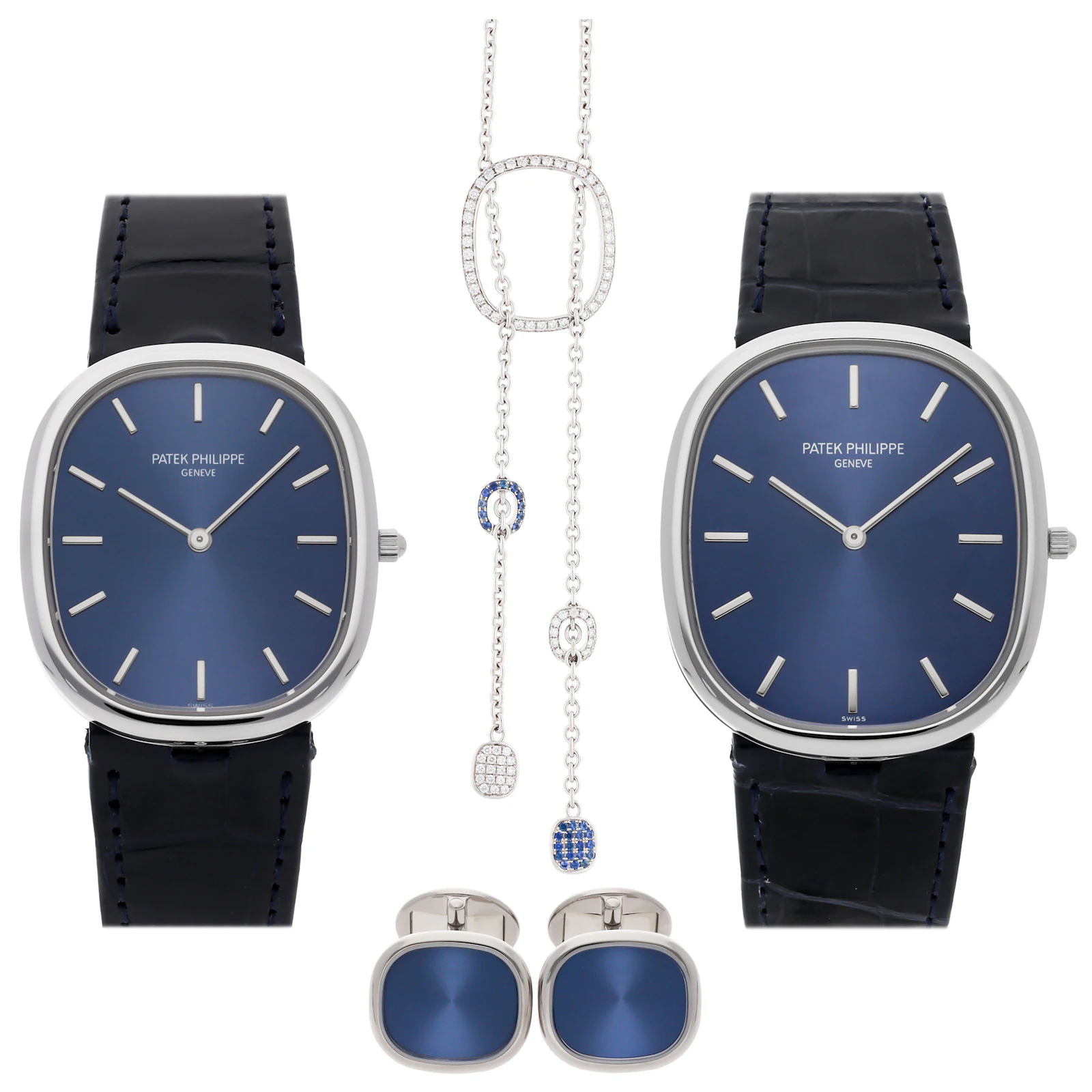 Pre-Owned Patek Philippe Golden Ellipse Anniversary Set Golden Ellipse (5738P001) manual wind watches, features a 34.5mm x 39.5mm platinum case surrounding a blue dial on a dark blue leather strap with a platinum tang buckle. Functions include hours and minutes. Golden Ellipse (3738100P001) manual wind watch, features a 31mm x 35mm platinum case surrounding a blue dial on a dark blue leather strap with a platinum tang buckle. Functions include hours and minutes. Ellipse 18k white gold, diamond and blue sapphire necklace (5738P001) Blue Golden Ellipse 18k white gold Cuff Links (2059102G) This watch set comes complete with the original box and papers. We back this watch with a 2-Year warranty by The 1916 Company!