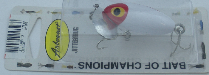 Arbogast 630-01 Jitterbug Length 2" Weight 1/4 oz Jitterbugs erratic action attracts small and large mouth bass and other game fish, when feeding on the surface The double-lobes lip creates a loud padding noise Can be retrieved continuously or by hesitation Color 01-White/Red Head |