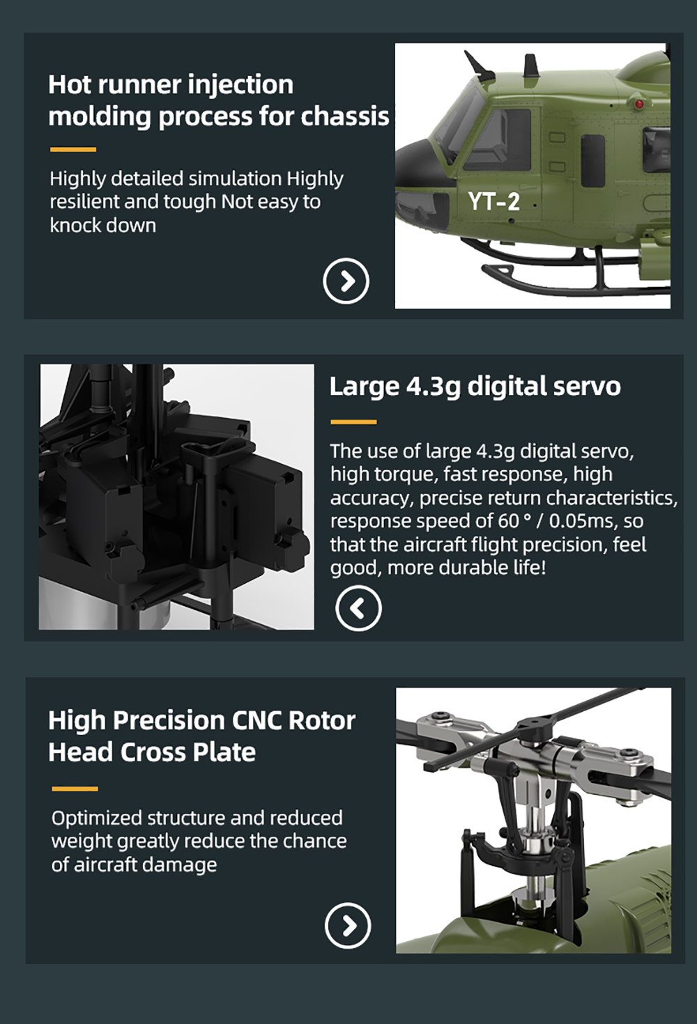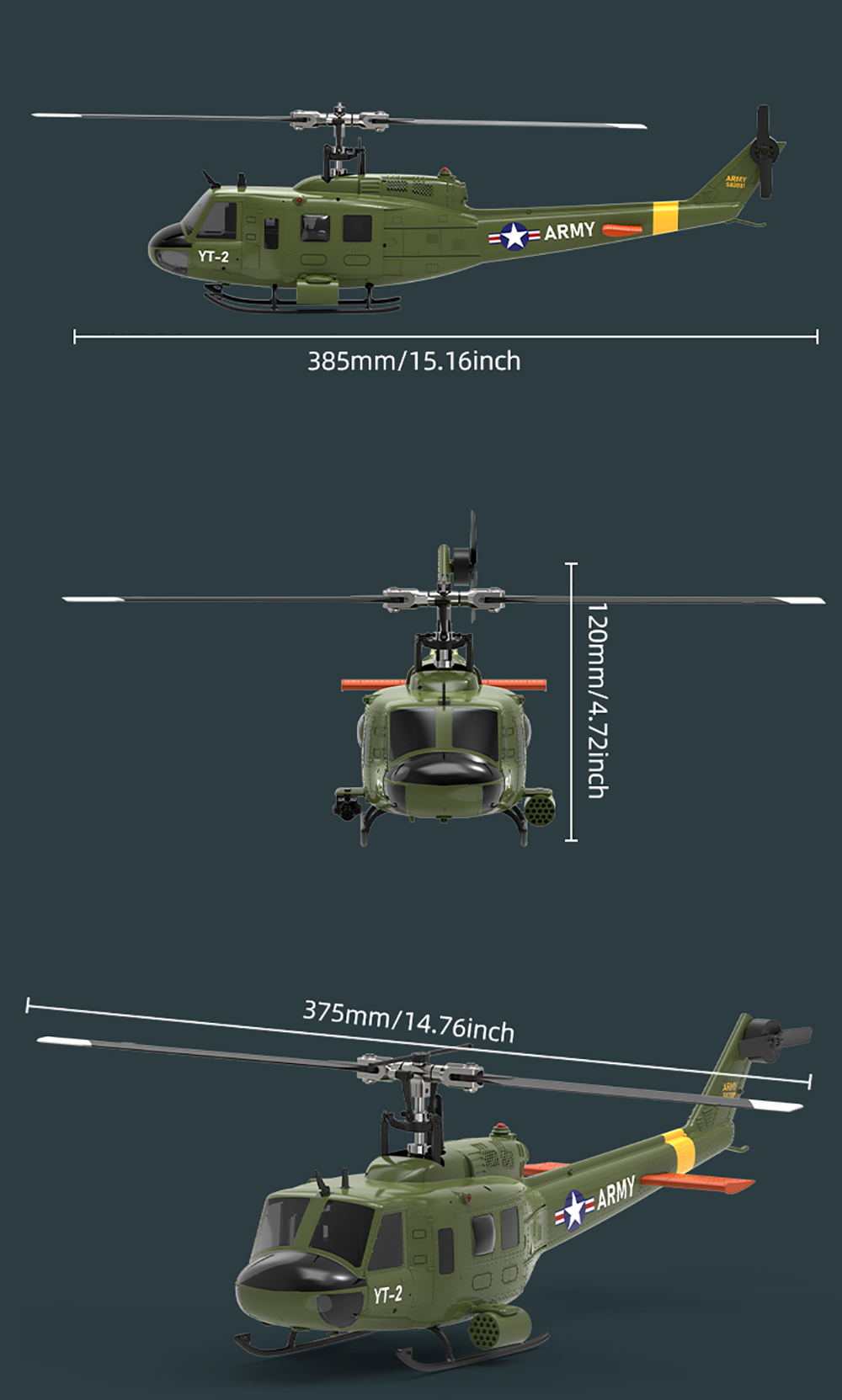 1. Equal scale: Based on the UH-1 Huey helicopter, reduced to 1:34 scale with real data.