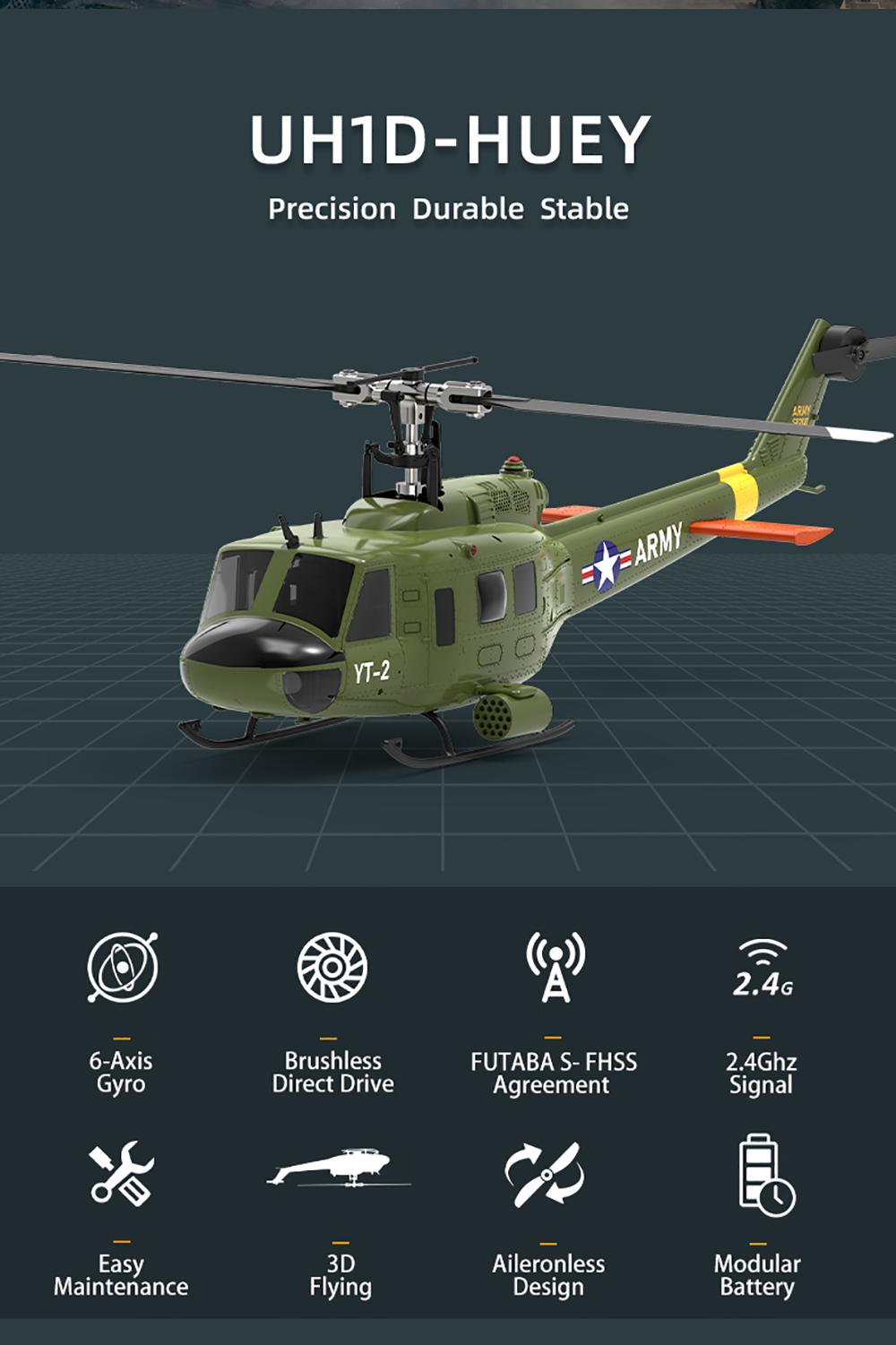 2025 New F07-V UH-1 with 6-axis gyro stabilization system, 3D flight, brushless motor RC airplane, expandable satellite receiver Support DSMX DSM2 PPM S-BUS system, metal FUTABA protocol Aerobatic version, suitable for beginner and intermediate flying.