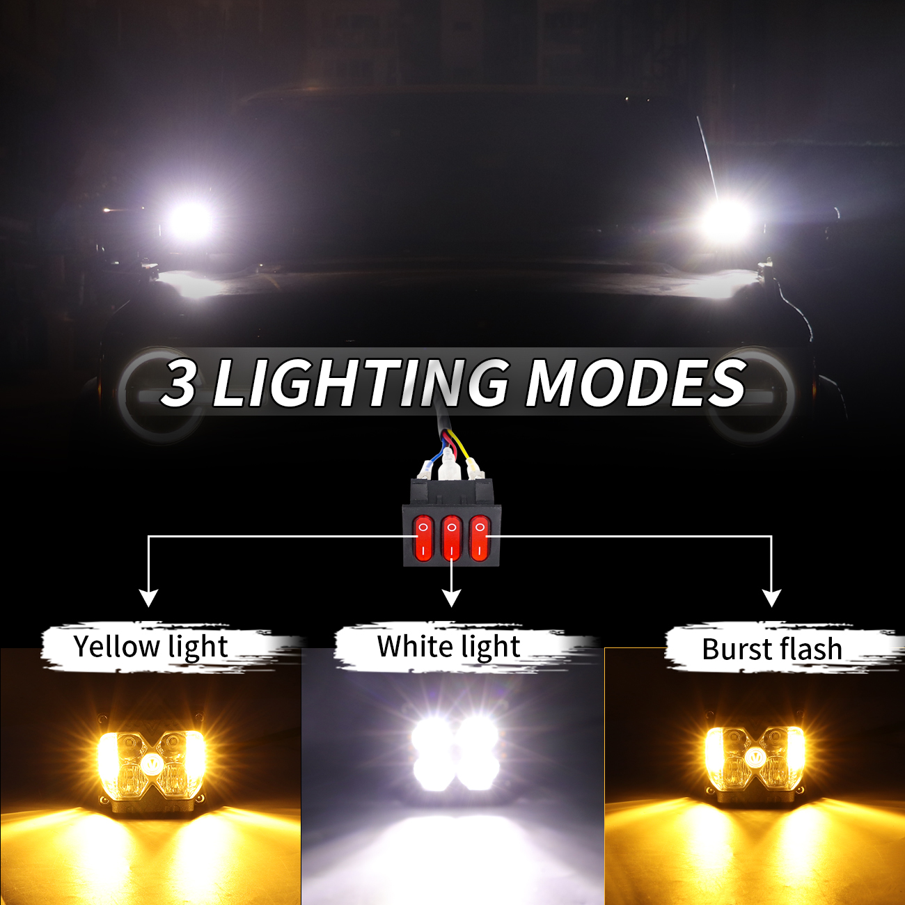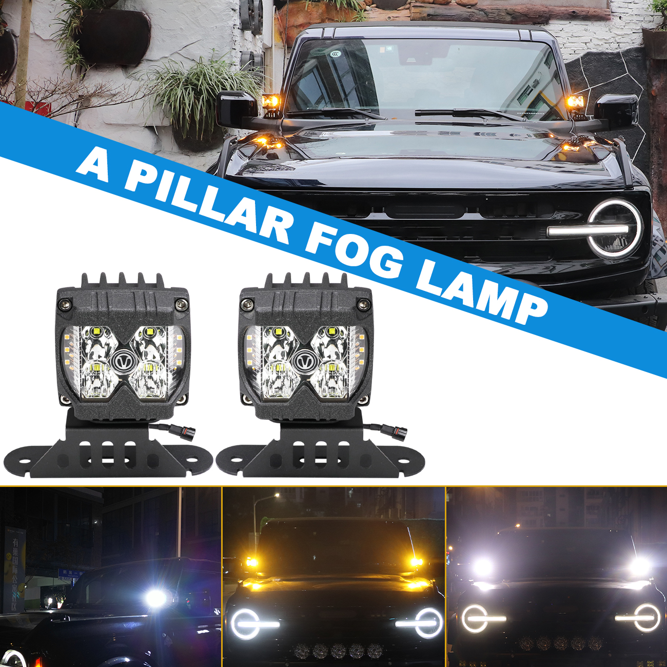 Description Product Name:A Pillar Spotlight Condition:New Color:Black Light color:White and amber Shape: Square Power: 40W Light mode: white light, yellow light, burst flash light Lumen: 7000LM Working temperature: -20°C~65°C Color temperature: 6500K Shell Material: Aluminum alloy housing Outside lens: PC lens Voltage: 12V-24V DC Waterproof level: IP67 Placement on Vehicle:Front, Front Left, Front Right Features:Durable, Easy Installation Fitment The Fog Lamp is compatible with for Ford Bronco 2021-2024 2/4 Doors. NOTE:Doesn't fit for Ford Bronco sport model! Features 1.A pillar light housing is made of high quality durable aluminum alloy, dustproof, rainproof, shockproof, can be used in all kinds of weather or situation; fog light is made of high quality LED chip, can send out 6500K 7000LM high brightness light and clear PC lens. 2. This LED light can emit 6500k white light, yellow light and burst flash three kinds of lights, super bright spot beam can well illuminate the dark road at night. Package Included 2x LED Work Light and Wiring Harness and Bracket