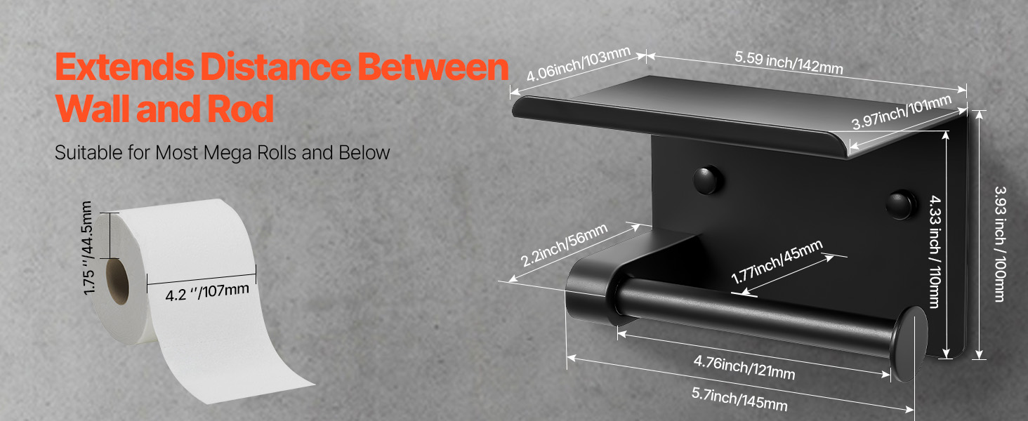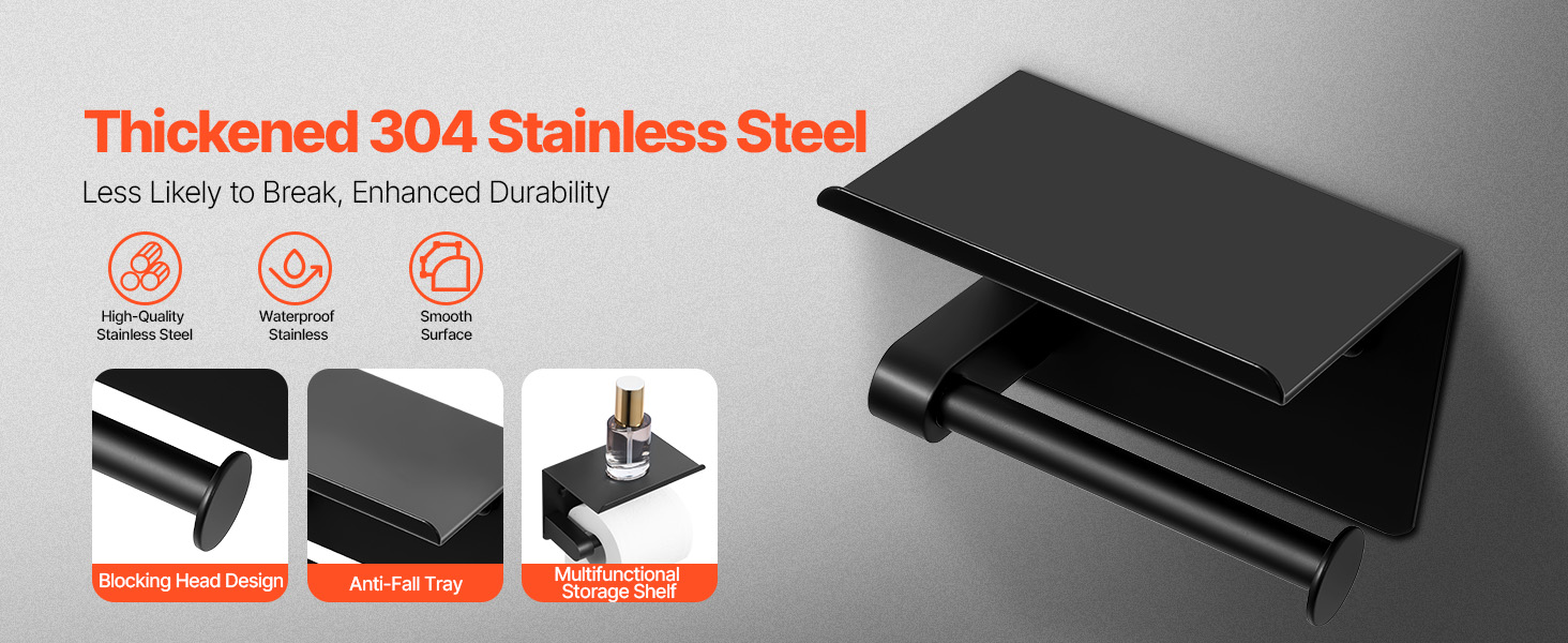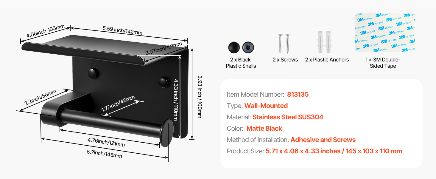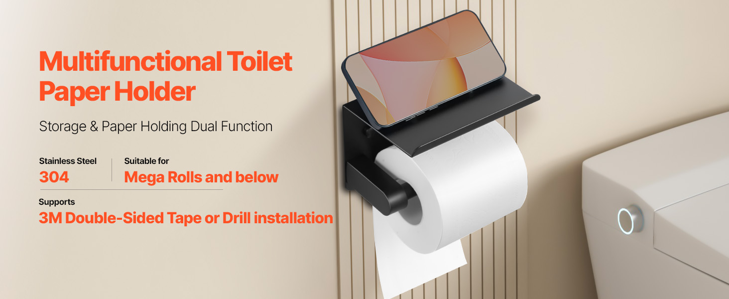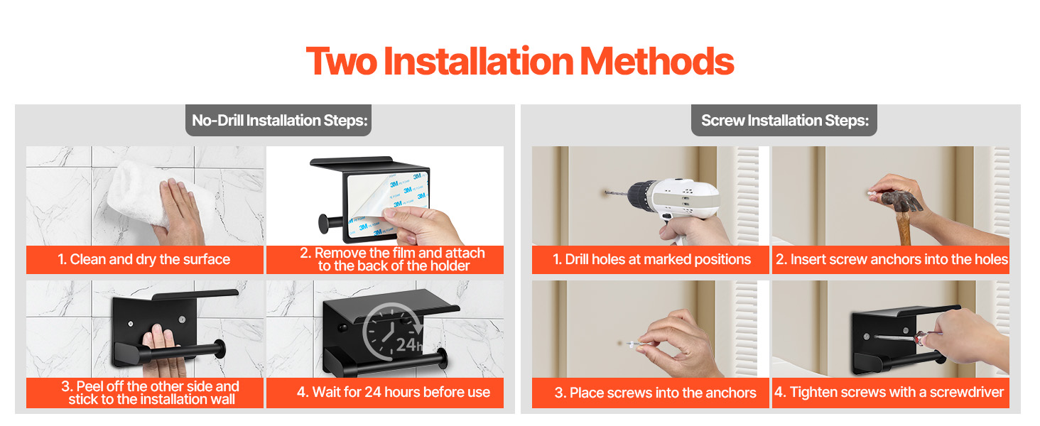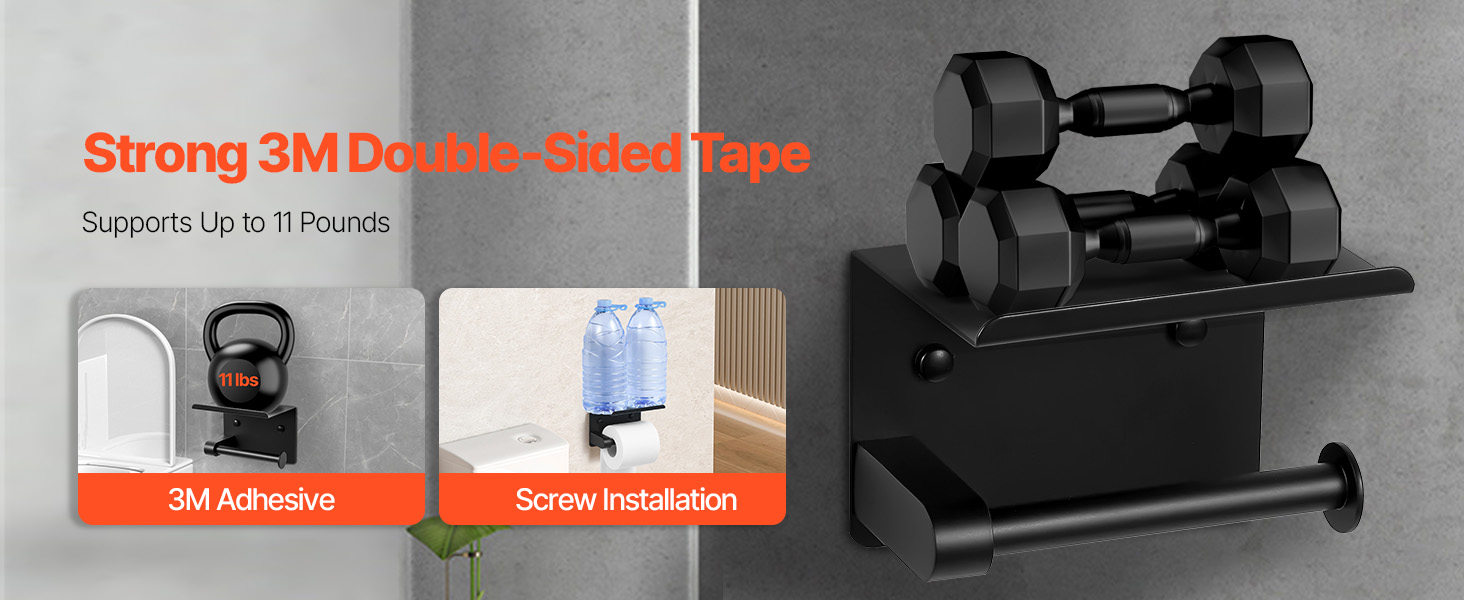 Equipped with powerful 3M double-sided adhesive, this bathroom tissue holder supports up to 11 lbs without worrying about storage items falling. For a more secure installation with screws, it can hold even more, making it ideal for holding wet wipes, small plants, perfumes, and other items.